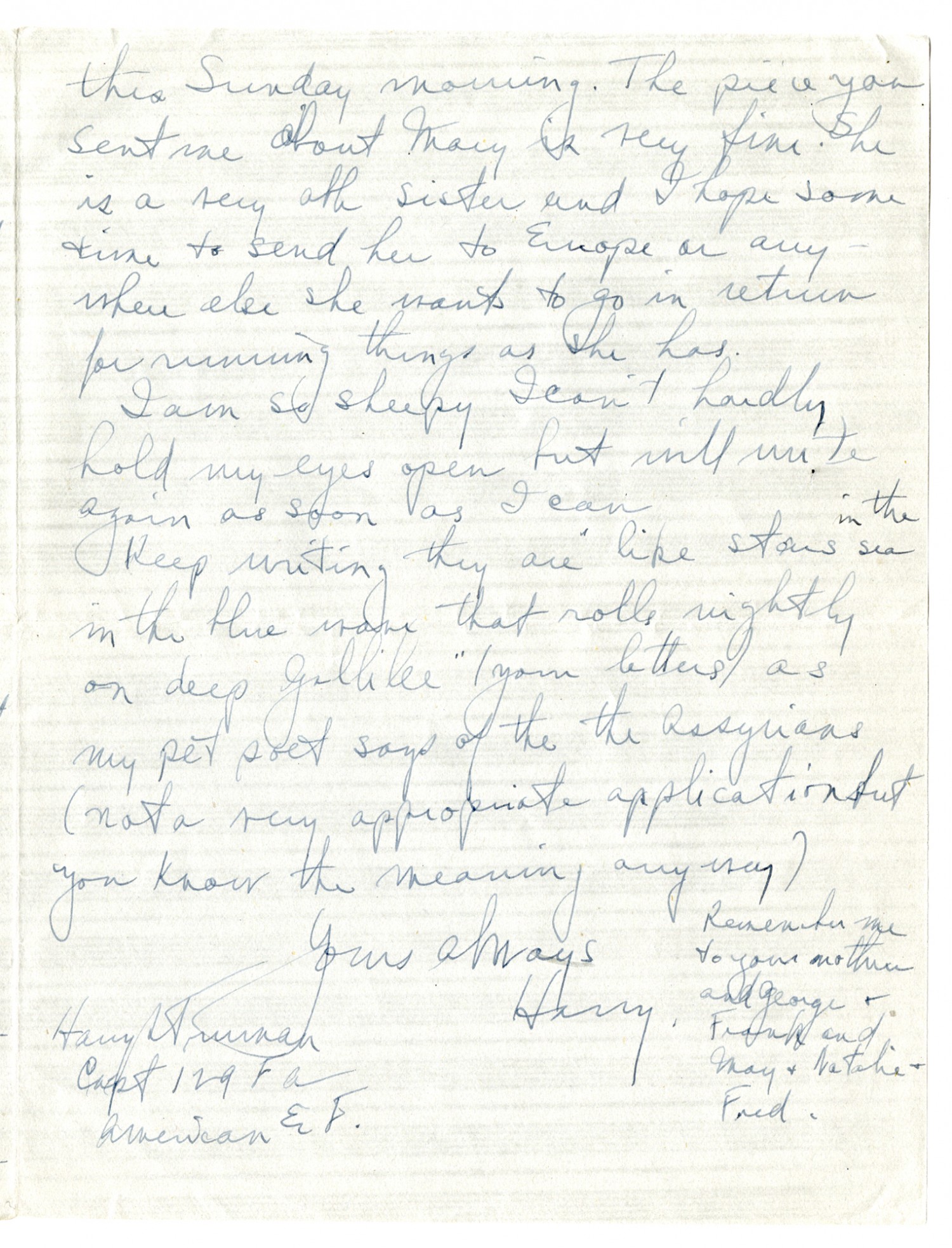 this Sunday morning. The piece you sent me about Mary is very fine. She is a very able sister and I hope sometime to send her to Europe or anywhere else she wants to go in return for running things as she has. I am so sleepy I can't hardly hold my eyes open but will write again as soon as I can. Keep writing. They are “like stars seen in the blue waves that roll nightly on deep Galilee” (your letters)—as my pet poet says of the Assyrians (not a very appropriate application but you know the meaning anyway). Yours always Harry. Remember me to your mother and George & Frank and May & Natalie & Fred. Harry S. Truman Capt 129 Fa American EF.