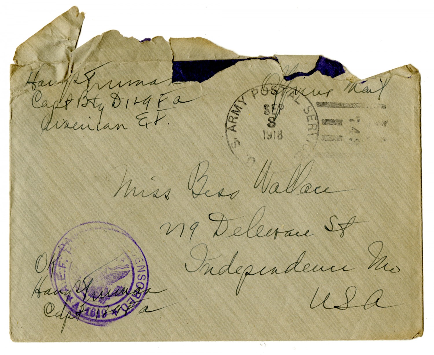 Harry S. Truman Capt Bty D 129 Fa American E.F. Officers Mail [stamp] U.S. ARMY POSTAL SERVICE SEP 8 1918 Miss Bess Wallace 219 Delaware St. Independence [Missouri] U.S.A. OK Harry S Truman Capt 129 Fa