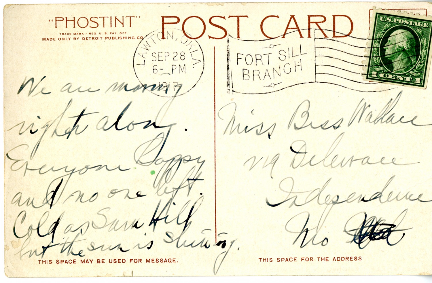 [September 28, 1917] [Postcard] [Stamp] LAWTON, OKLA. SEP 28 6- PM 1917] We are moving right along. Everyone happy and no one left. Cold as Sam Hill but the sun is shining. [stamp] FORT SILL BRANCH Miss Bess Wallace 219 Delaware Independence, [Missouri]