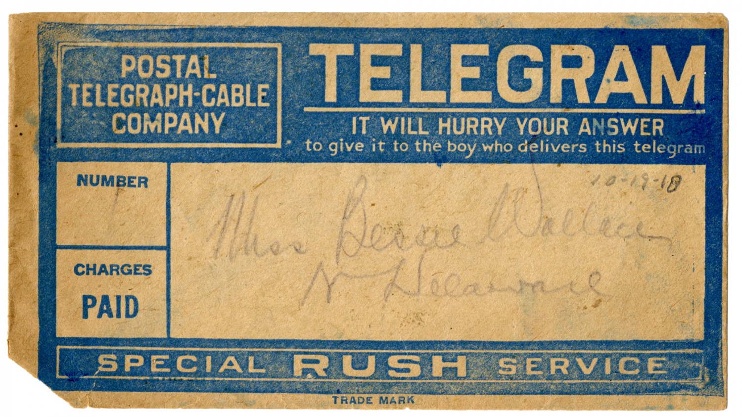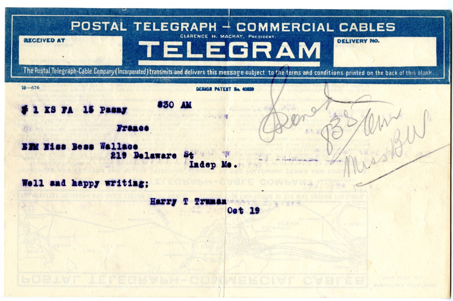 | Source | Truman, Harry S. Telegram to Bess Wallace. 19 October 1918. Papers of Harry S. Truman Pertaining to Family, Business and Personal Affairs; Correspondence from Harry S. Truman to Bess Wallace, 1910-1919. HST-FBP_5-61_01. Harry S. Truman Library and Museum, |