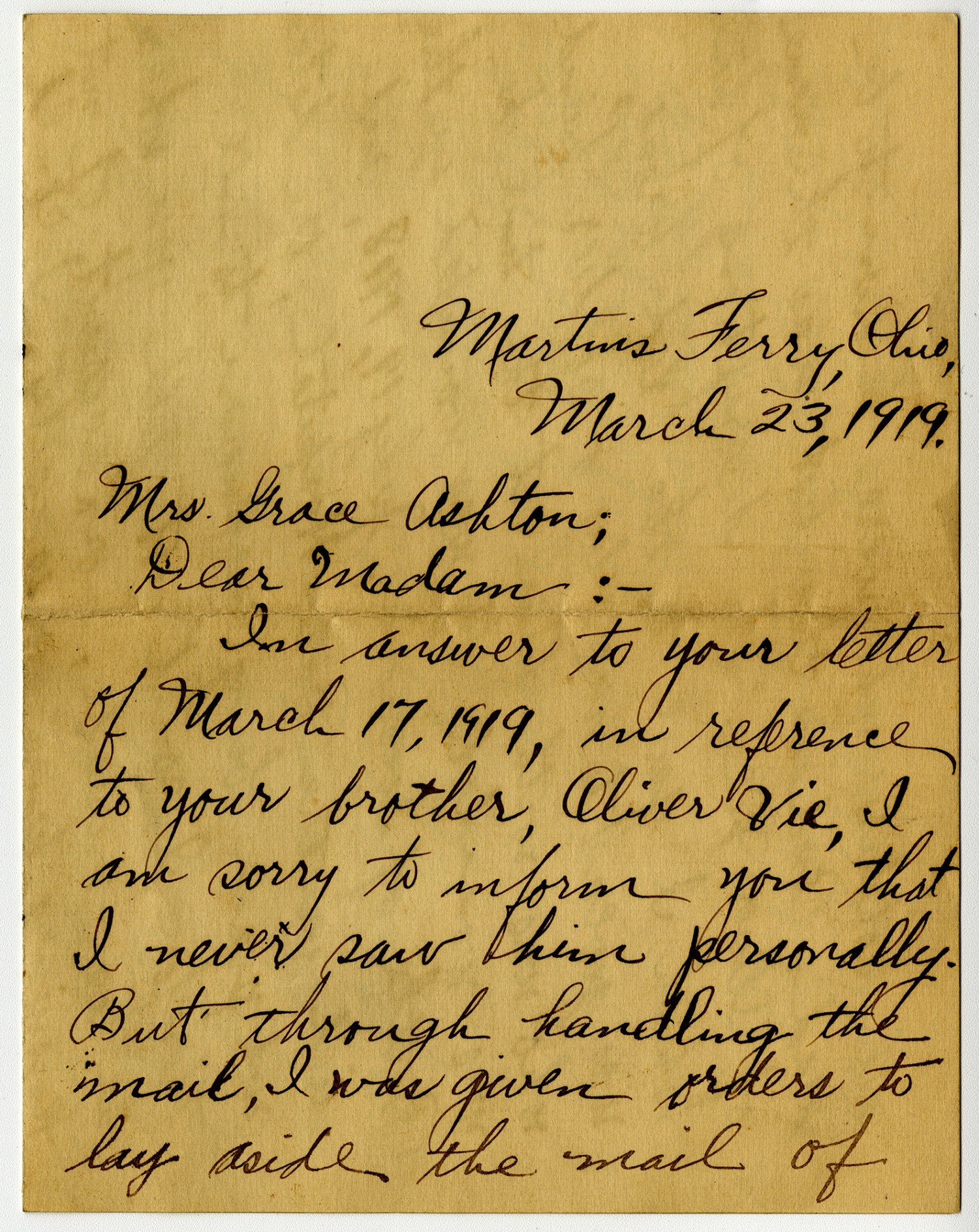 Martins Ferry, Ohio, March 23, 1919. Mrs. Grace Ashton: Dear Madam:- In answer to your letter of March 17, 1919, in reference to your brother, Oliver Vie, I am sorry to inform you that I never saw him personally. But through handling the mail, I was given orders to lay aside the mail of