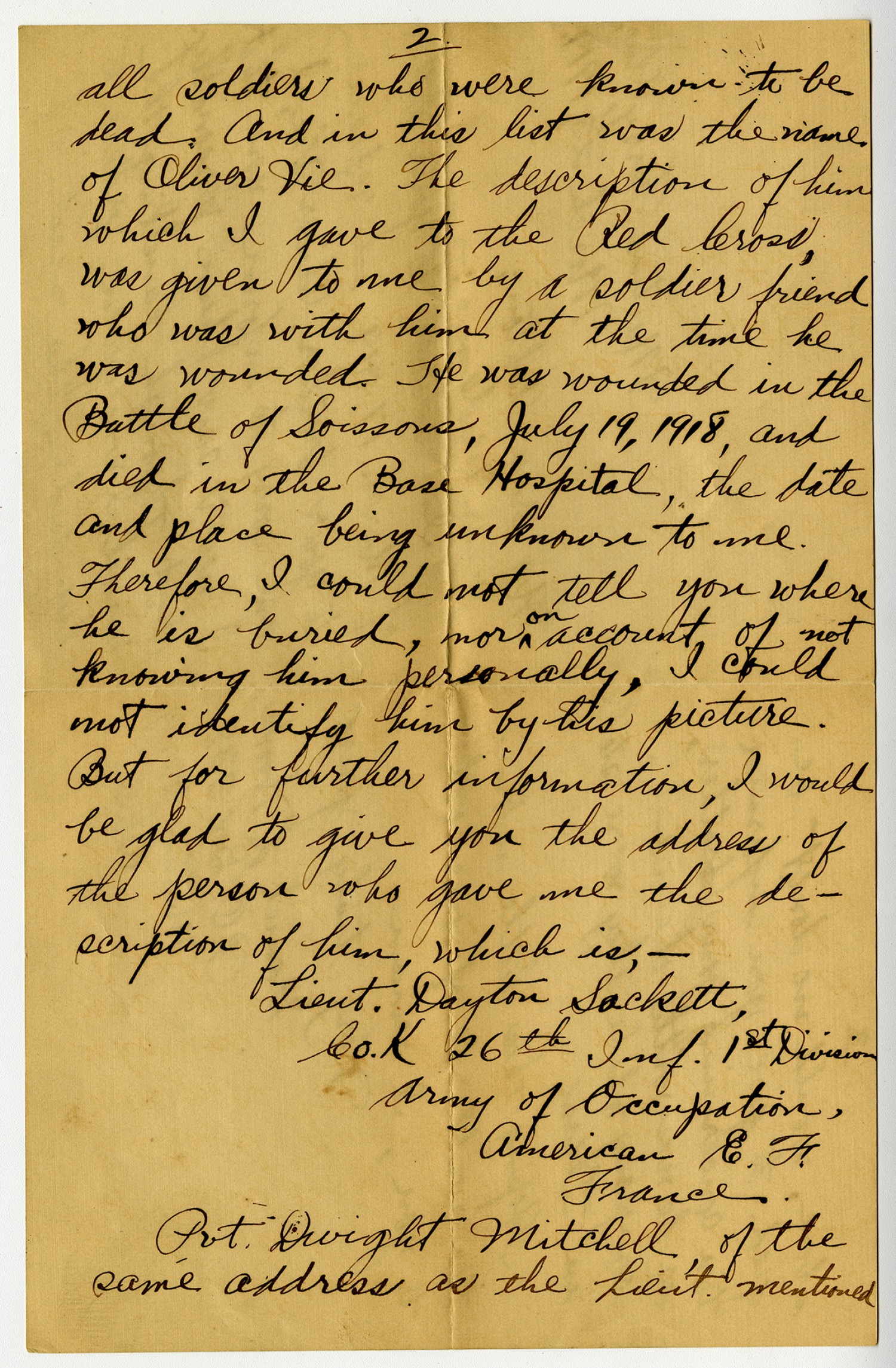 [page 2] all soldiers who were known to be dead. And in this list was the name of Oliver Vie. The description of him which I gave to the Red Cross, was given to me by a soldier friend who was with him at the time he was wounded. He was wounded in the Battle of Soissons, July 19, 1918, and died in the Base Hospital, the date and place being unknown to me. Therefore, I could not tell you where he is buried, nor an account of not knowing him personally, I could not identify him by this picture. But for further information I would be glad to give you the address of the person who gave me the description of him, which is, - Lieut. Dayton Sockett, Co. K 26th Inf. 1st Division Army of Occupation, American E. F. France Pvt. Dwight Mitchell, of the same address as the Lieut. mentioned