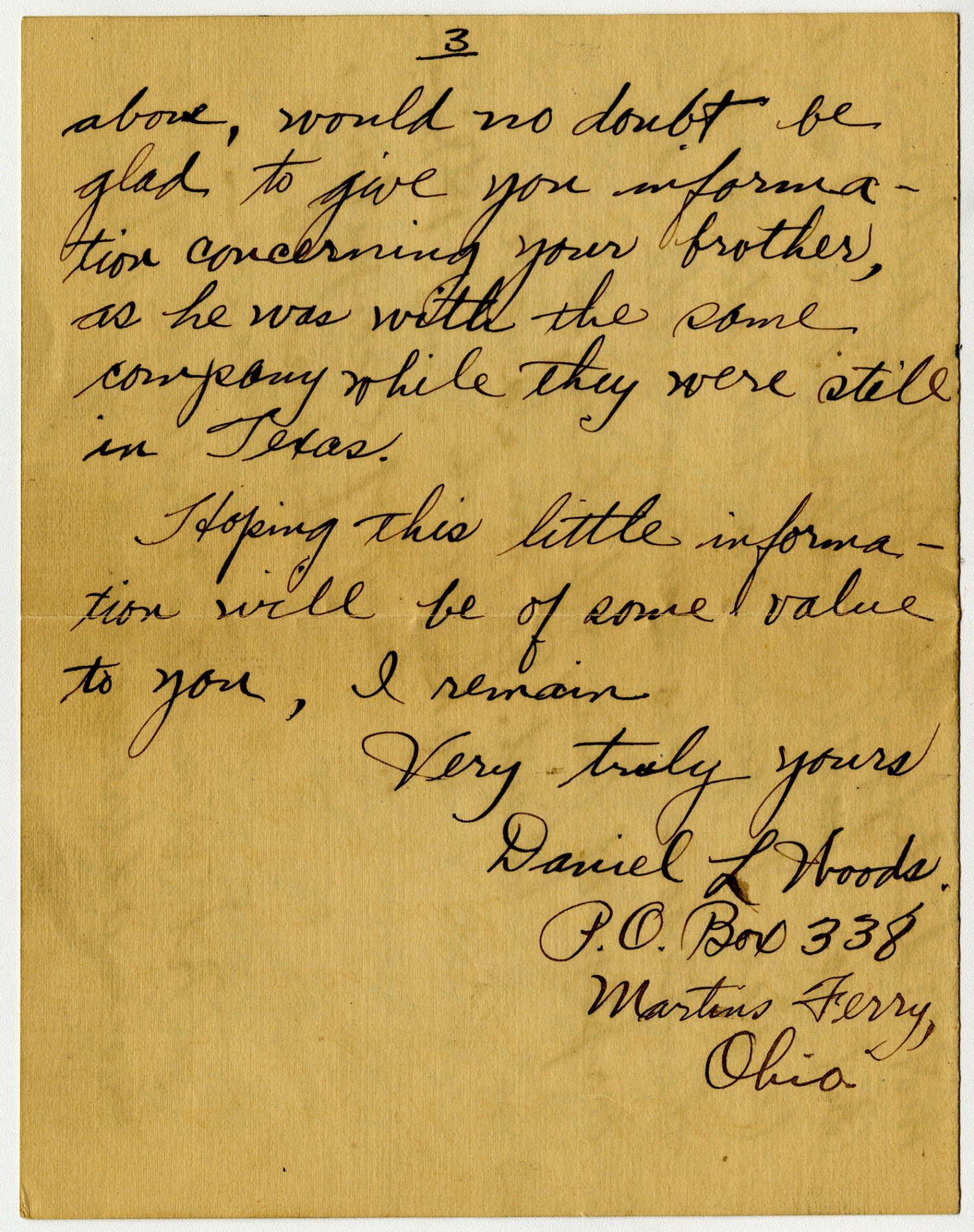 [page 3] above, would no doubt be glad to give you information concerning your brother, as he was with the same company while they were still in Texas. Hoping this little information will be of some value to you, I remain Very truly yours Daniel L Woods P.O. Box 338 Martins Ferry, Ohio