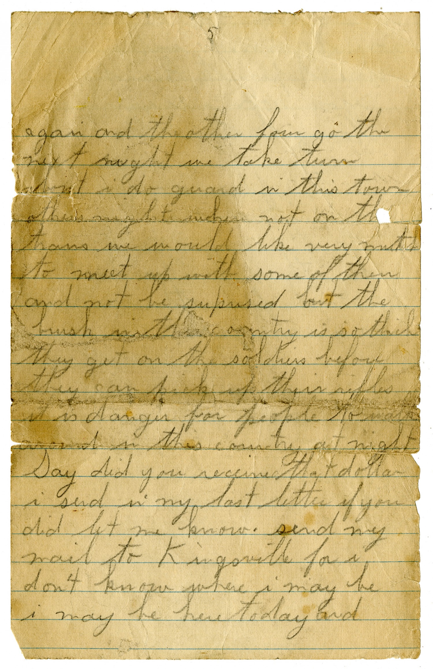 [page 5] agan and the other four go the next night we take turn [ms illegible: 1 wd] I do guard in this town [ms illegible: 1 wd] night trenches not on the trains we would like very mutch to meet up with some of them and not be surprised but the brush with [ms illegible: 2 wds] is settled they get on the soldiers before they can pick up their rifles it is danger for people to go around in this country at night Say did you receive that dollar I send in my last letter if you did let me know send my mail to Kingsville [Texas] for I don