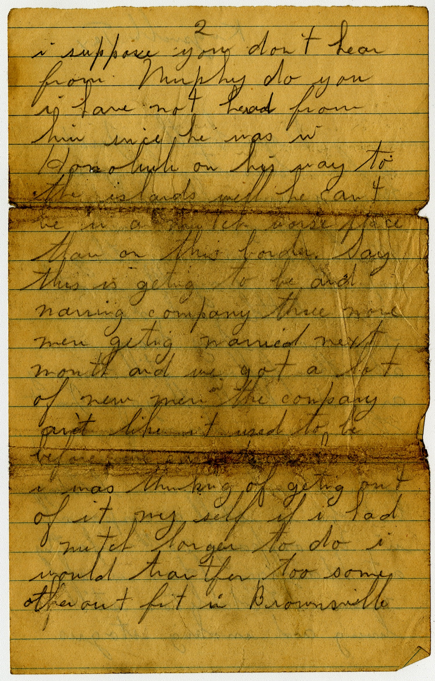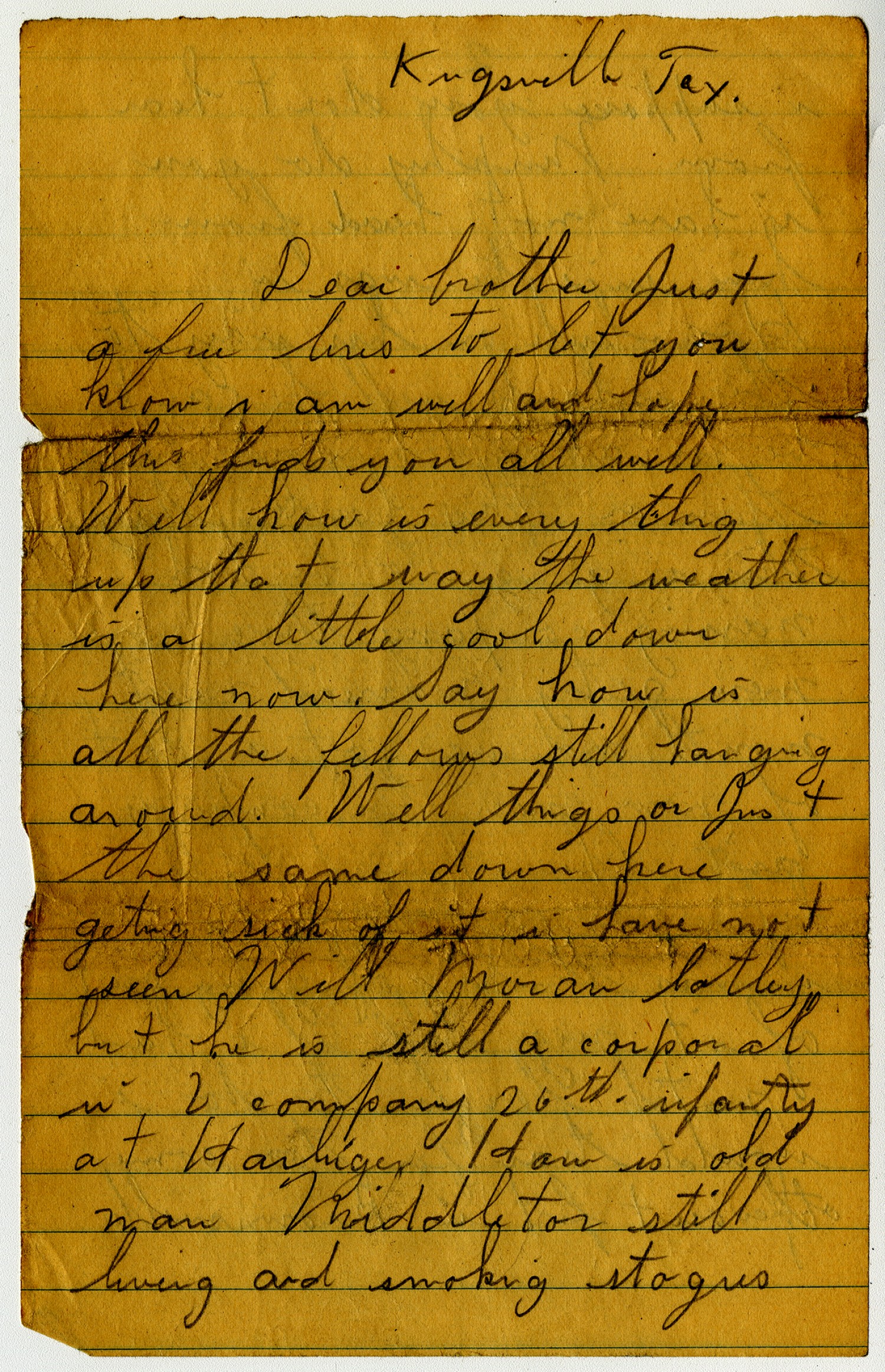 Kingsville [Texas] Dear brother just a few lines to let you know i am well and hope this finds you all well. Well how is every thing up that way the weather is a little cool down here now. Say how is all the fellows still hanging around. Well things or Just the same down here geting sick of it i have not seen Will Moran latley but he is still a corporal in L Company 26th infantry at Harlingen [Texas] How is old man Middleton still living and smoking stogies