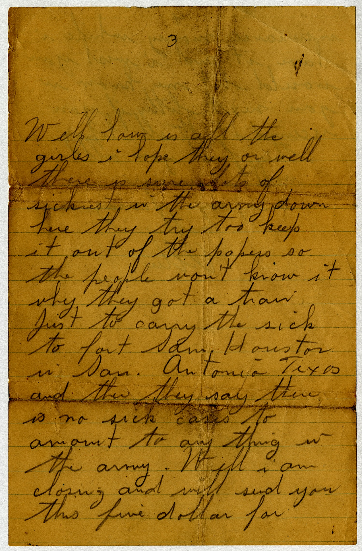 [page 3] Well how is all the girls i hope they or well there is sure lots of sickest in the army down here they try too keep it out of the papers so the people won