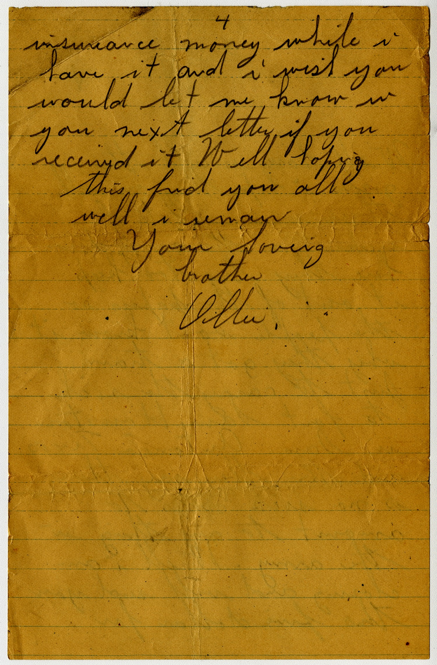 [page 4] insurance money while i have it and i wish you would let me know in your next letter if you received it Well hoping this find you all well i remain Your loving brother Ollie