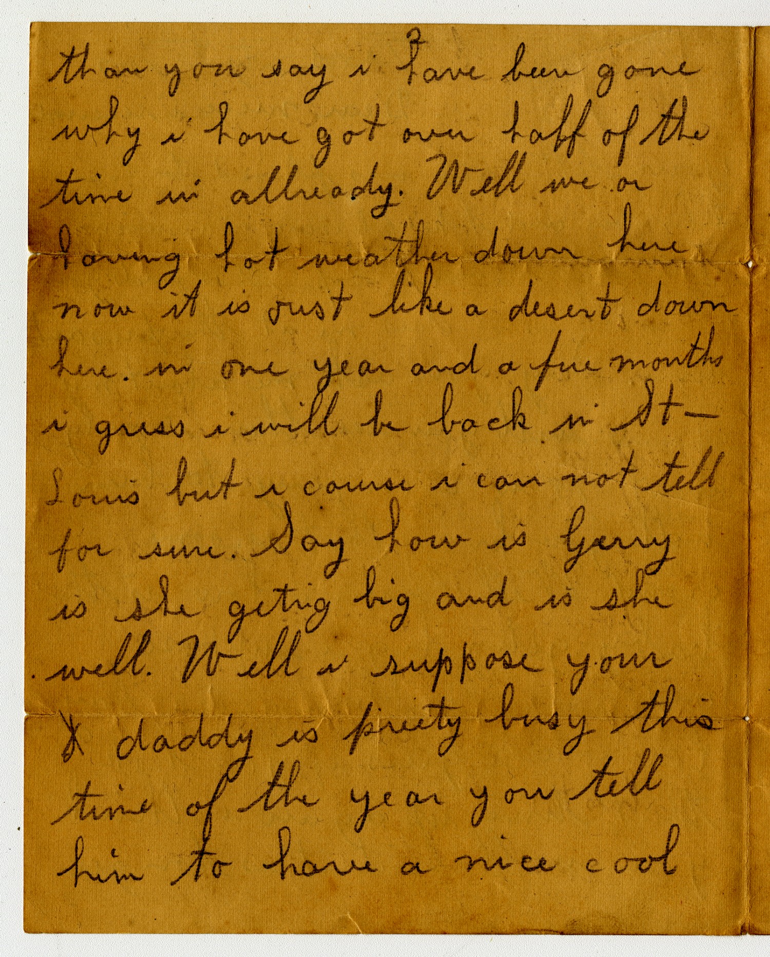 [page 2] than you say i have got over half of the time in allready. Well we or having hot weather down here now it is just like a desert down here. in one year and five months i guess i will be back in [St. Louis] but i course i can not tell for sure. Say how is Gerry is she geting big and is she well. Well I suppose your daddy is pretty busy this time of the year you tell him to have a nice cool