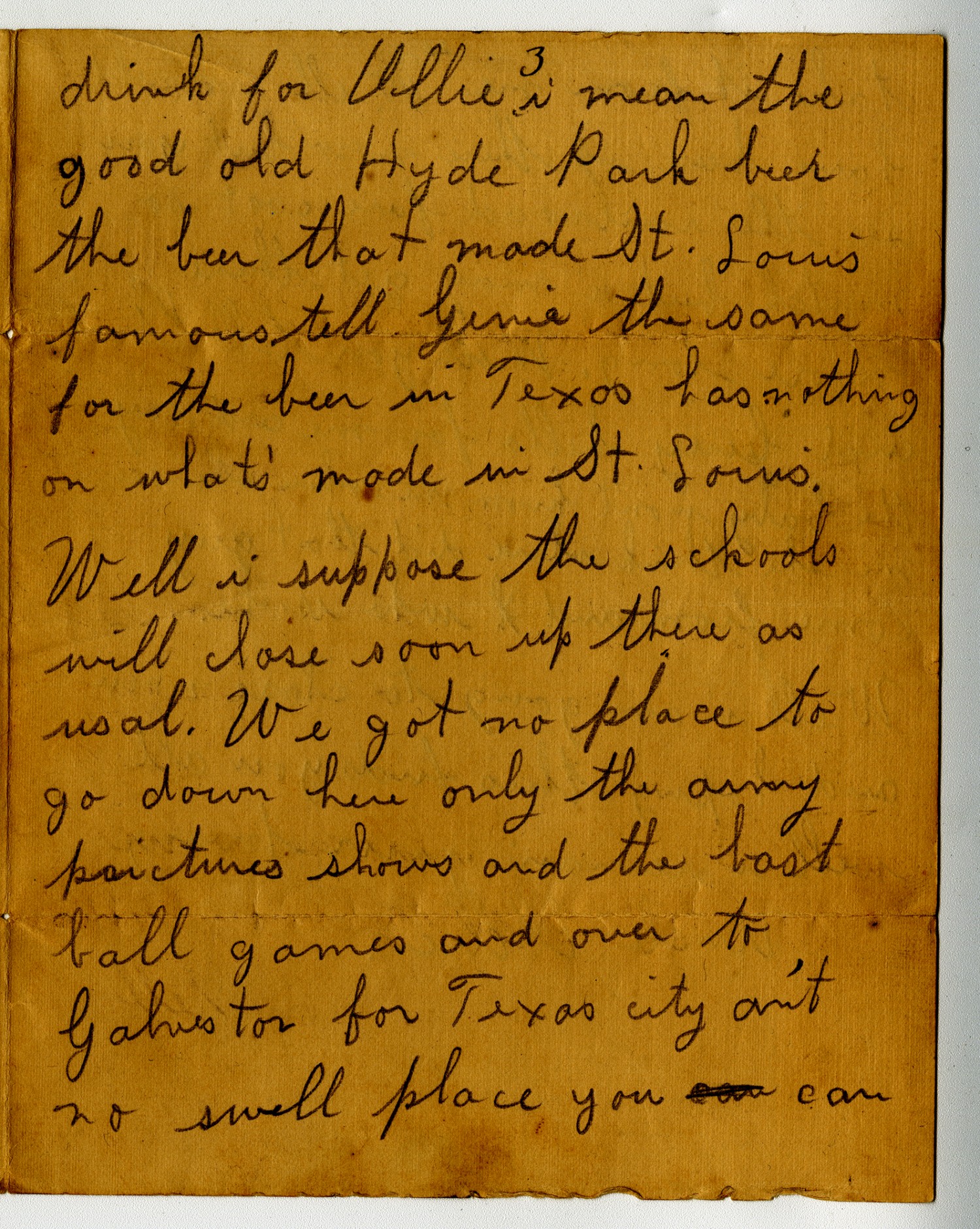 [page 3] drink for Ollie i mean the good old Hyde Park beer the beer that made St. Louis [Missouri] famous tell Genie the same for the beer in Texas has nothing on what