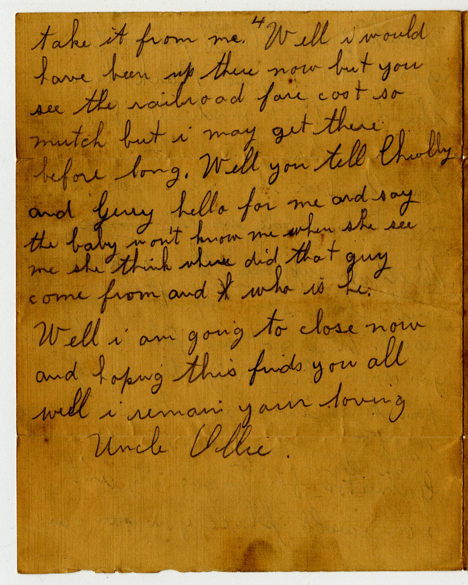 [page 4] take it from me. Well i would have been up there now but you see the railroad fare cost so mutch but i may get there before long. Well you tell Chubby and Gerry hello for me and say the baby won