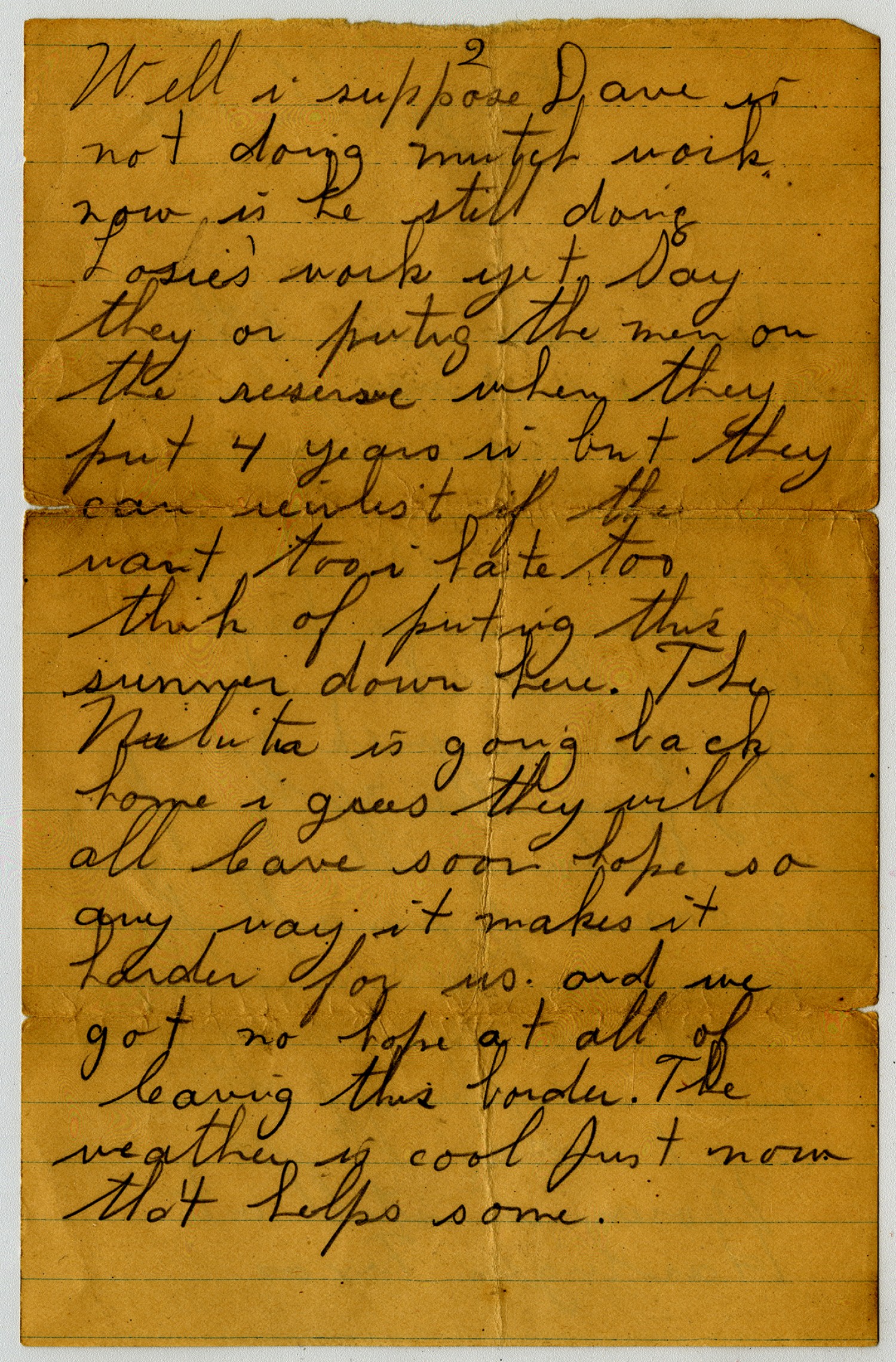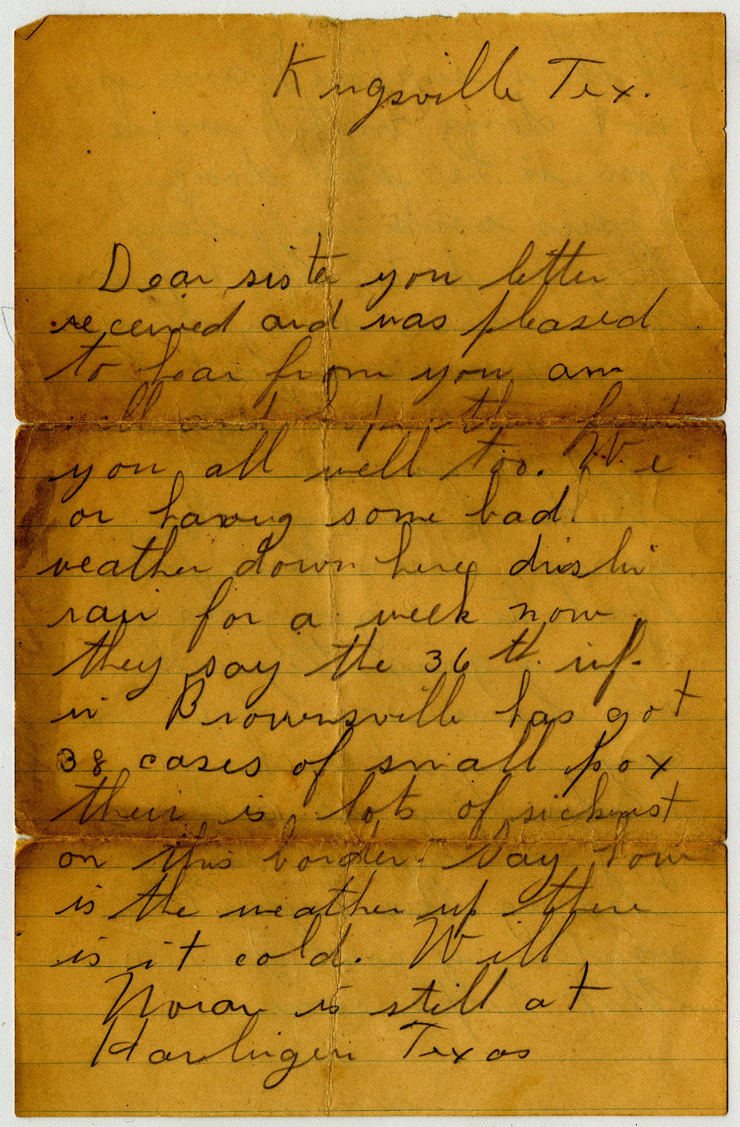 Kingsville [Texas] Dear sister you letter received and was pleased to hear from you am well and [ms illegible: 4 wds] you all well too. We or having some bad weather down here [ms illegible: 1 wd] rain for a week now they say the 36th inf. in Brownsville [Texas] has got 38 cases of small pox their is lots of sicknest on this border. Say how is the weather up there is it cold. Well Moral is still at Harlingen Texas