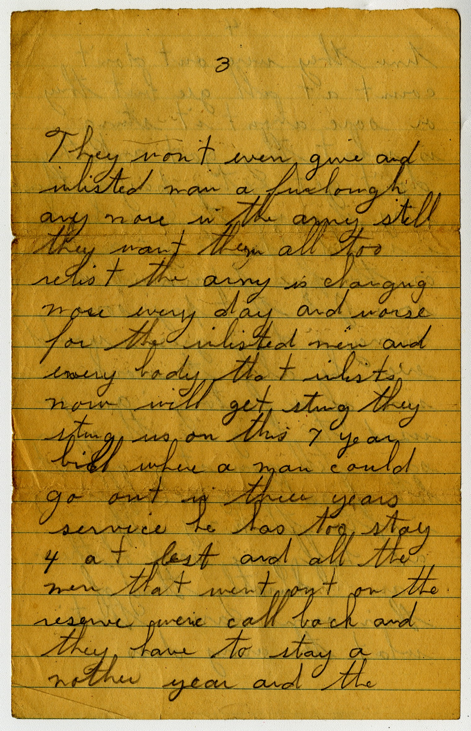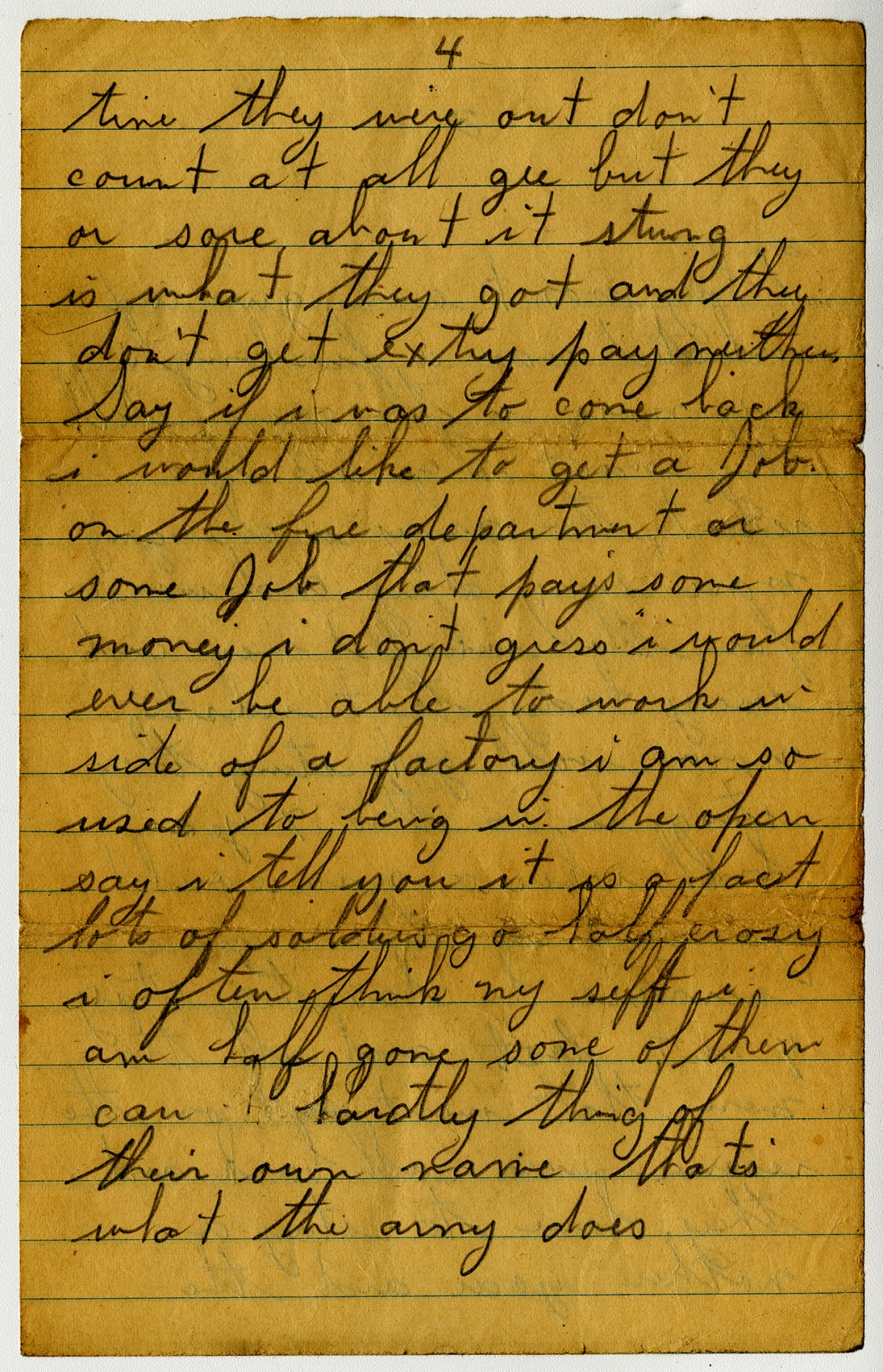 | Description | Oliver Vie was born January 28, 1887, in St. Louis, Missouri. After working for several years in a shoe factory, he enlisted in the army in October 1913, Company K, 26th Infantry. He served along the Mexican border before going with the first contingent to France in June 1917. He fought in the battles of Cantigny and Soissons and was wounded in action and died July 20, 1918. In this letter, Vie wrote his sister Grace and discussed a smallpox outbreak among troops and his frustration with army practices. He also mentioned possible plans for post-army life. |