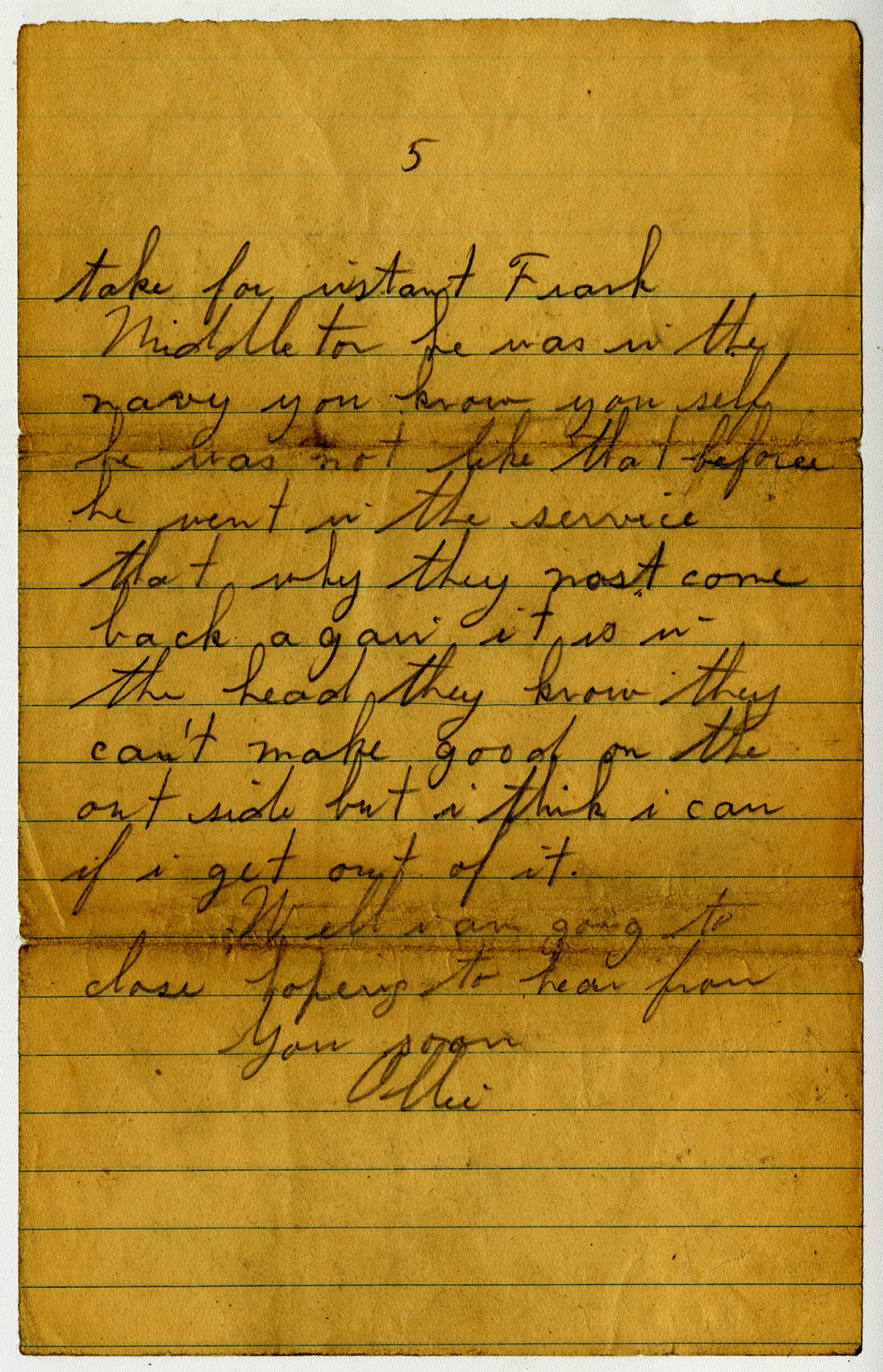 [page 5] take for instant Frank Middleton he was in the navy you know you self he was not like that before he went in the service that why they most come back agan it is in the head they know they can