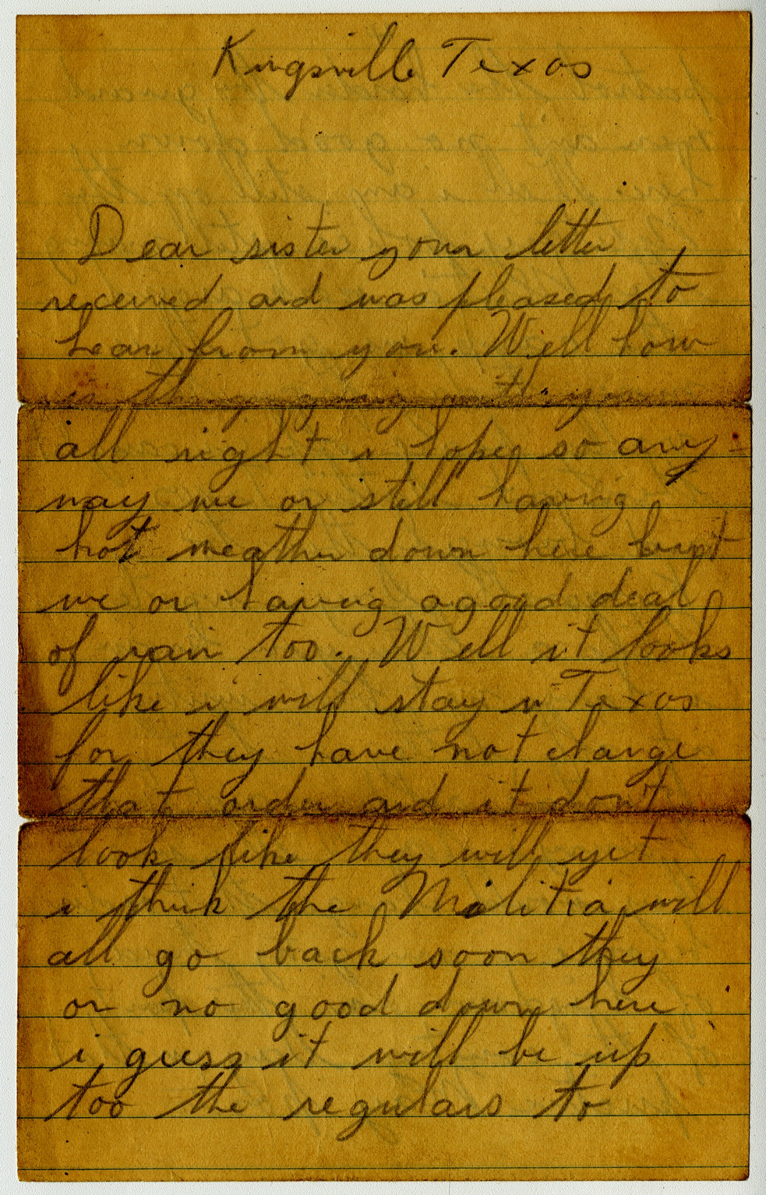 Kingsville Texas Dear Sister your letter received and was pleased to hear from you. Well how is things going everything all right i hope so any way we or still having hot weather down here but we or having a good deal of rain too. Well it looks like i will stay in Texas for they have not change that order and it don