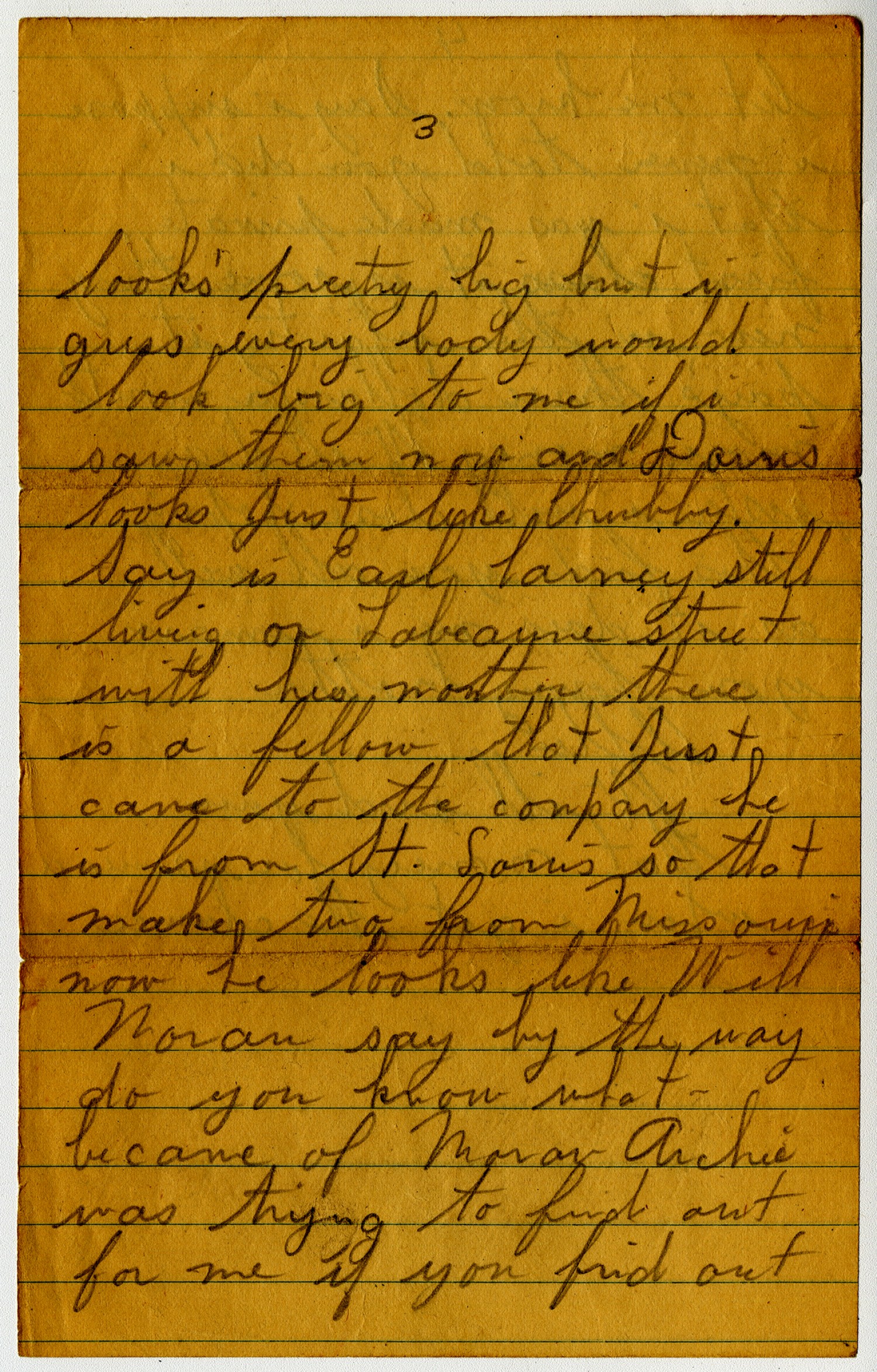 3 looks pretty big but i gues every body would look big to me if i saw them now and Davis looks just like Chubby. Say is Earl Carney still living on Labeaune street with his mother there is a fellow that just came to the company he is from St. Louis [Missouri] so that makes two from Missouri now he looks like Will Moran say by the way do you know what became of Moran Archie was trying to find out for me if you find out