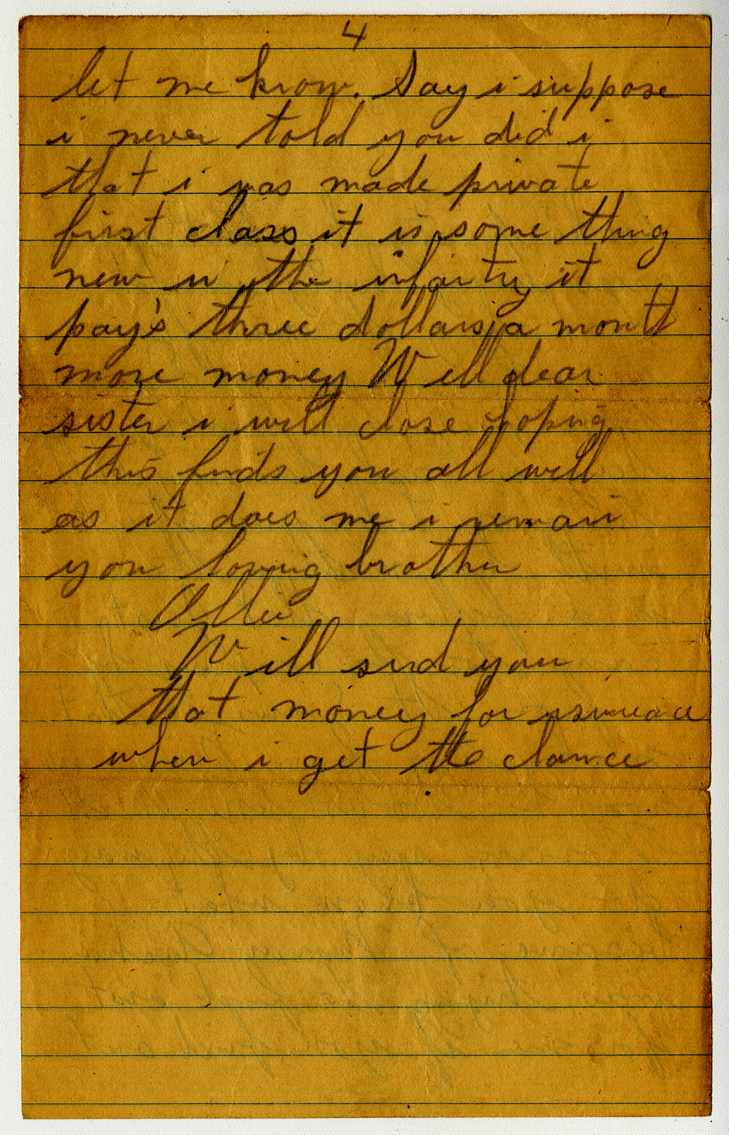 | Description | Oliver Vie was born January 28, 1887, in St. Louis, Missouri. After working for several years in a shoe factory, he enlisted in the army in October 1913, Company K, 26th Infantry. He served along the Mexican border before going with the first contingent to France in June 1917. He fought in the battles of Cantigny and Soissons and was wounded in action and died July 20, 1918. In this letter, Vie wrote his sister Grace and expressed frustration with the militia. He also mentioned a promotion to private first class and other family matters. |