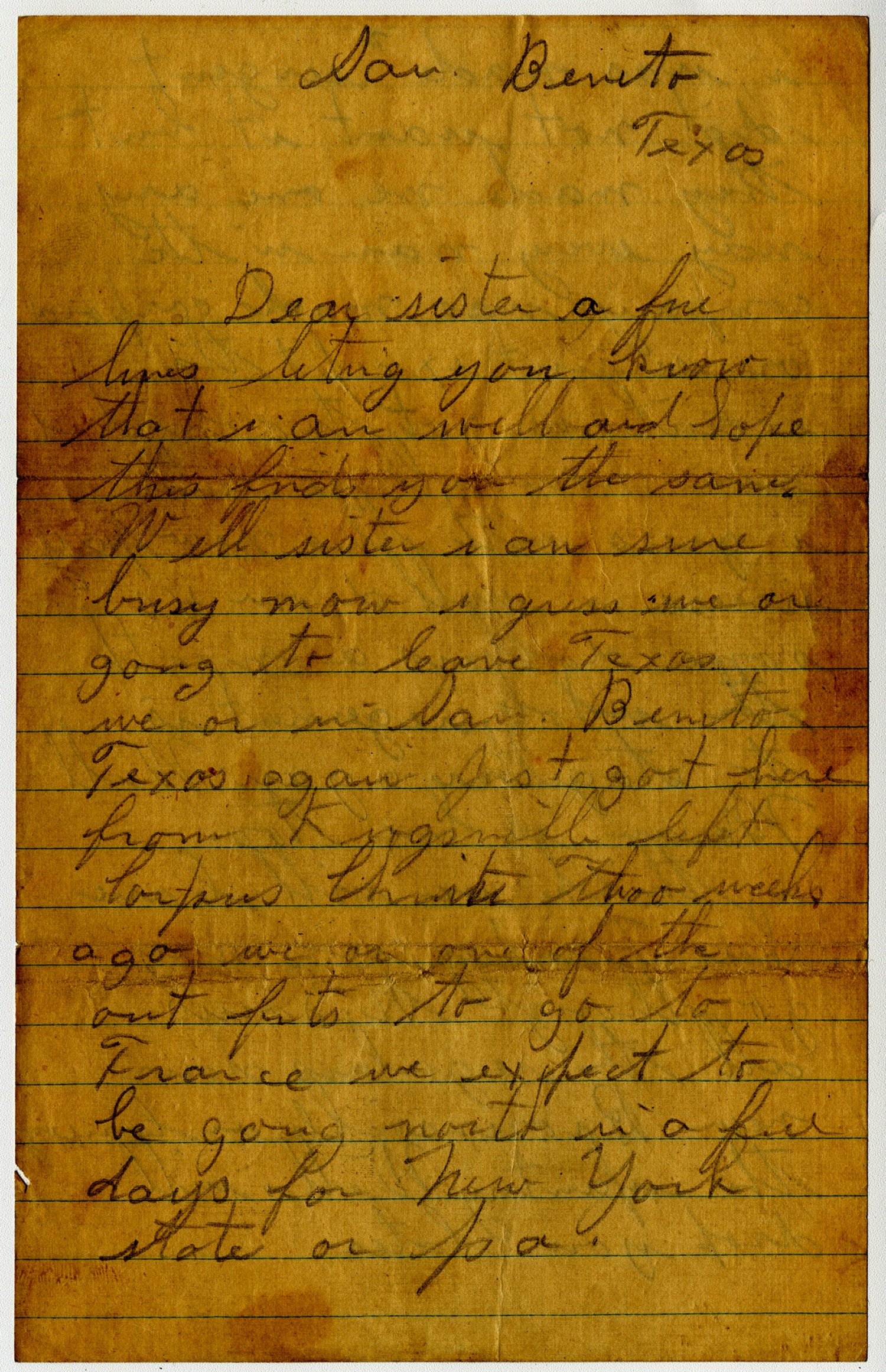 San Benito Texas Dear sister a few lines letng you know that i am well and hope this finds you the same. Well sister i am sure busy now i guess we or going to leave Texas we or in San Benito Texas again just got here from Kingsville [Texas] left Corpus Christi [Texas] two weeks ago we or one of the out fits to go to France we expect to be gong north in a few days for New York state or [Pennsylvania]