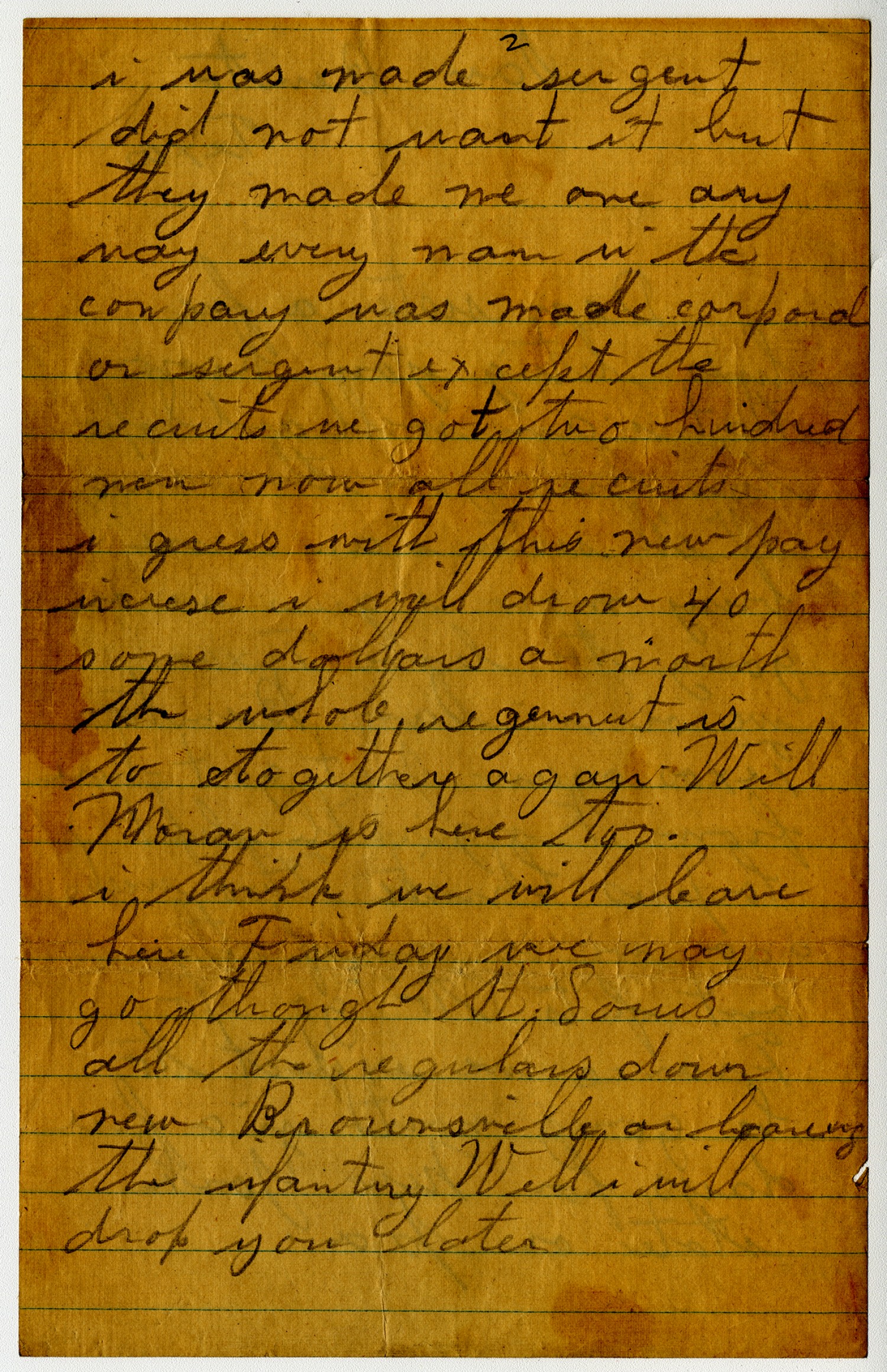[page 2] i was made a sergeant did not want it but they made me one any way every man in the company was made corporal or sergent except the recruits we got two hundred men now all recruits i guess with the new pay increse i will draw 40 some dollars a month the whole regiment is to together agan Will Moran is here too. i think we will leave here Friday we may go though St. Louis [Missouri] all the regulars down new Brownsville [Texas] or leaving the infantry Well i will drop you later