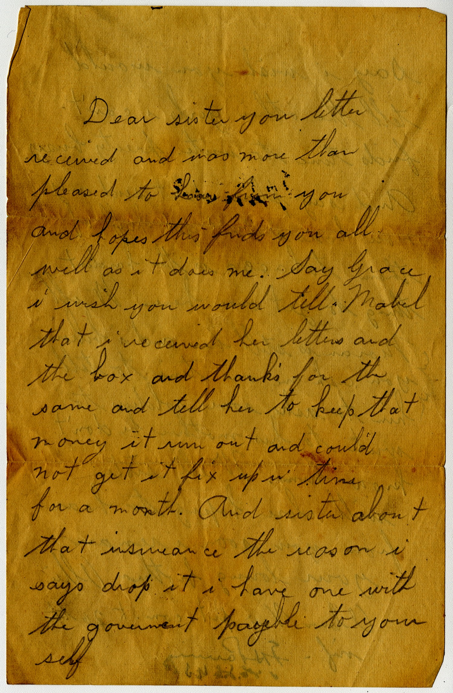 Dear sister you letter received and was more that pleased to hear from you and hopes this finds you all well as it does me. Say Grace i wish you would tell Mabel that i received her letters and the box and thank