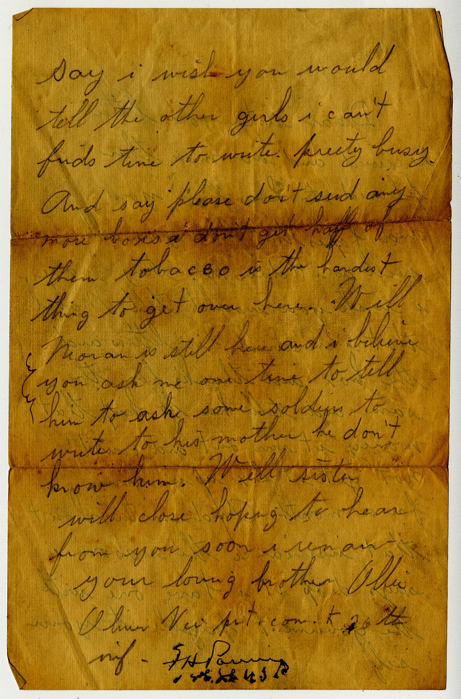 | Source | Vie, Oliver. Letter to Grace. n.d. Oliver Vie Papers, 1913-1919. A2285. Missouri History Museum, Saint Louis, Missouri. |
