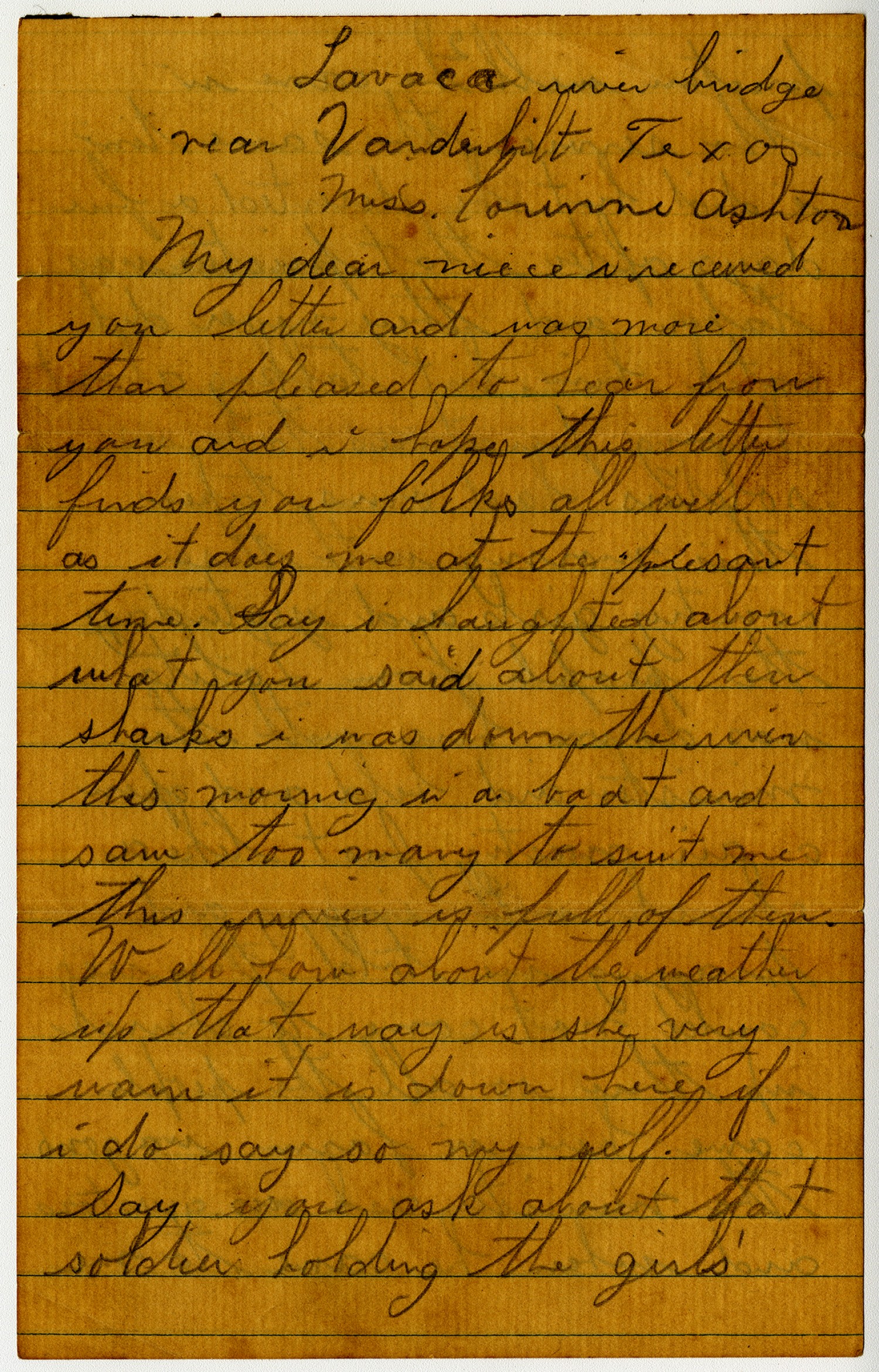 Lavaca river bridge near Vanderbilt Texas Miss Corrine Ashton My dear niece I received you letter and was more than pleased to hear from you and I hope this letter finds you folks all well as it does me at the present time. Say I laughted about what you said about then sharks I was down the river this morning in a boat and saw too many to suit me this river is full of them. Well how about the weather up that way is she very warm it is down here if I do say so my self. Say you ask about that soldier holding the girls