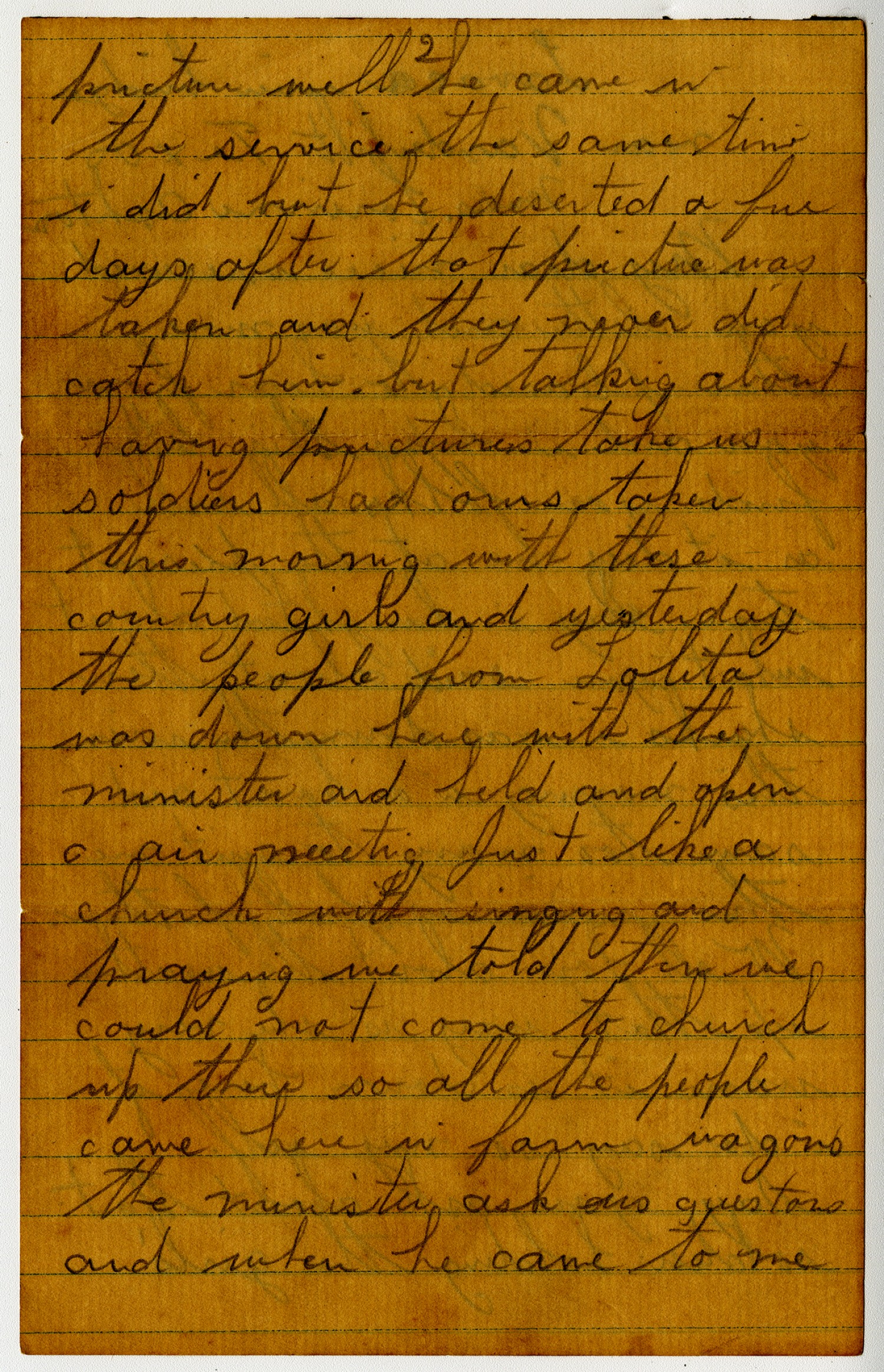 [page 2] picture well he came in the service the same time I did but he deserted a few days after that picture was taken and they never did catch him but talking about having pictures take us soldiers had ours taken this morning with these country girls and yesterday the people from Lolita was down here with the minister and held and open and air meeting Just like a church with singing and praying we told them we could not come to church up there so all the people came here in farm wagons the minister ask us questions and when he came to me
