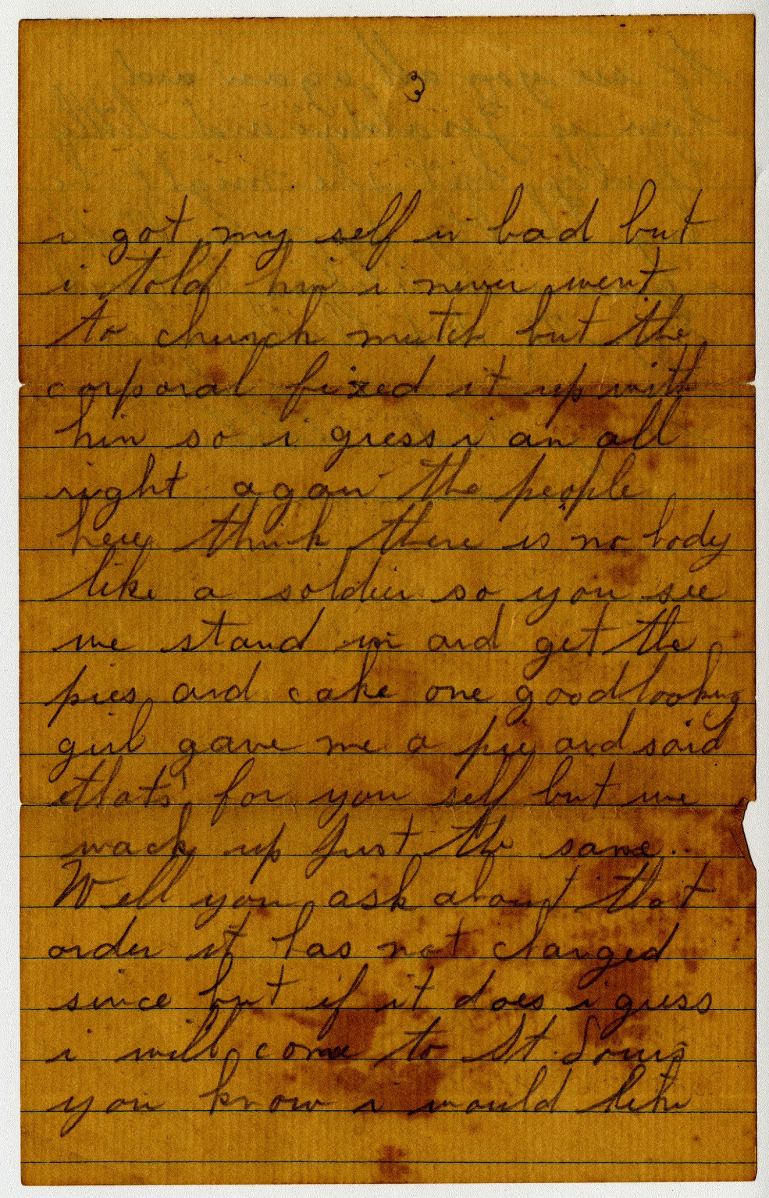[page 3] I got my self in bad but I told how I never went to church mutch but the corporal fixed it up with him so I guess I am all right agan the people here think there is nobody like a soldiere so you see we stand in and get the pies and cake one good looking girl gave me a pie and said that