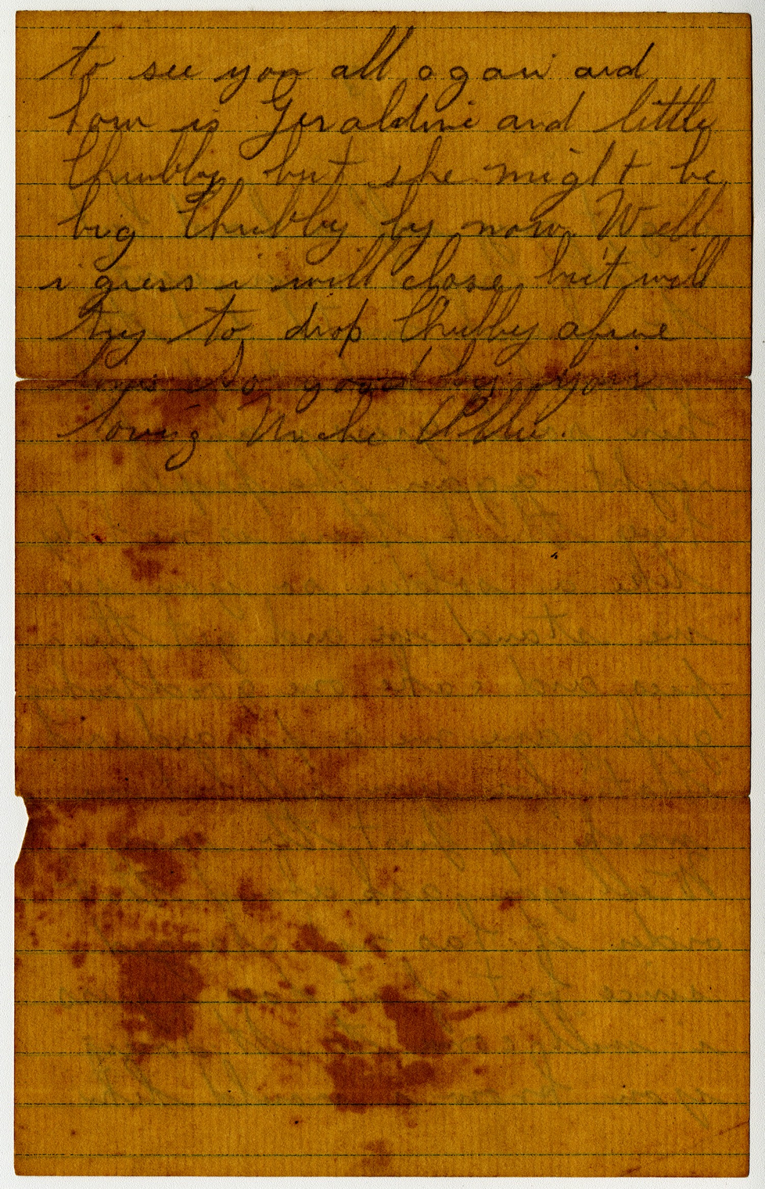 To see you all agan and how is Geraldine and little Chubby but she might be big Chubby by now Well I gues I will close but will try to drop Chubby a fine [ms illegible: 1 wd] good by your loving Uncle Ollie