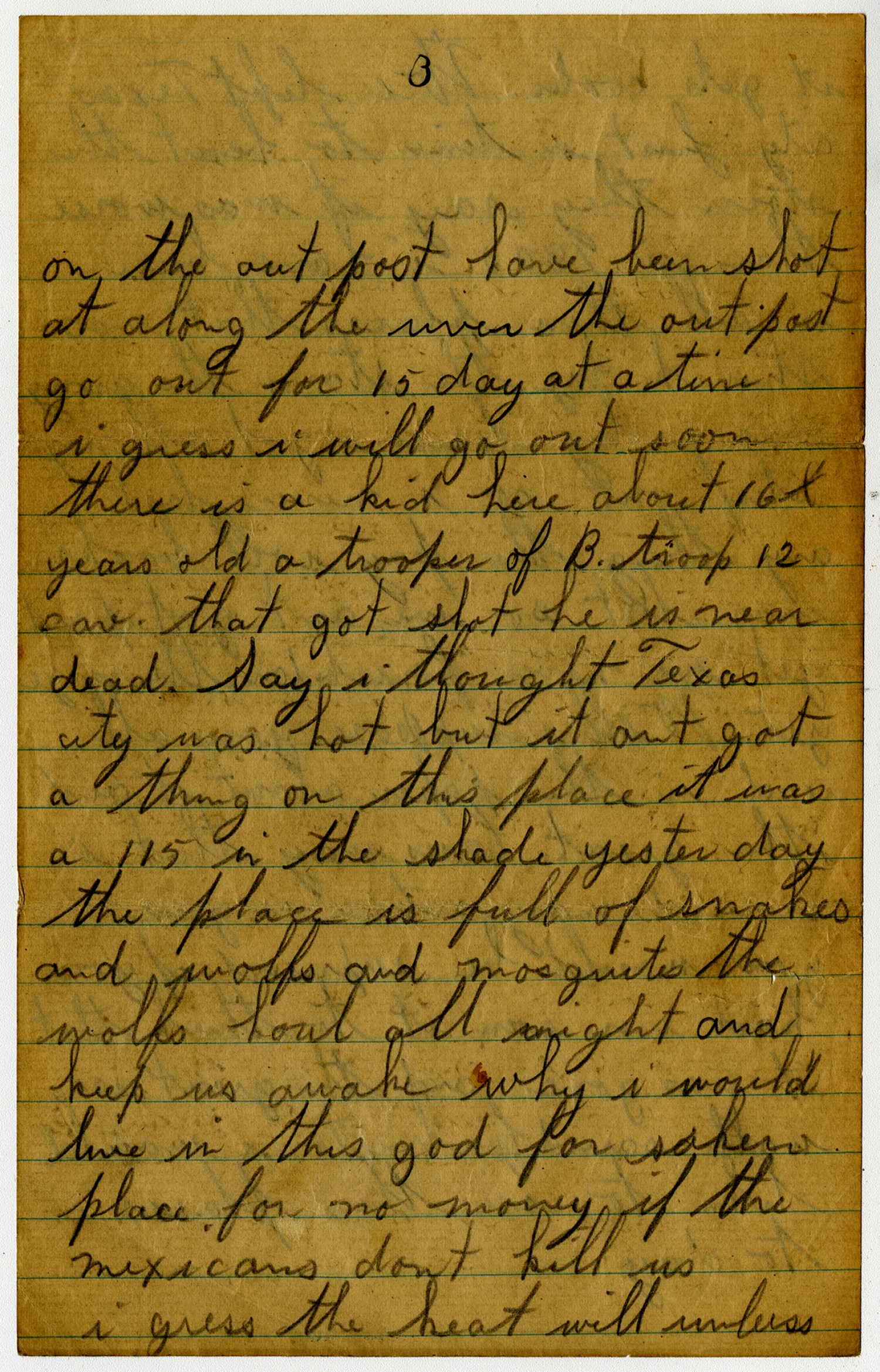 [page 3] on the out post have been shot at along the river the out post go out for 15 day at a time i guess i will go out soon there is a kid here about 16 years old a trooper of B. troop 12 cav. that got shot he is near dead. Say i thought Texas city [Texas] was hot but it ant got a thing on this place it was a 115 in the shade yesterday the place is full of snakes and wolfs and mosquites the wolfs howl all night and keep us awake why i would live in this god for saken place for no money if the mexicans dont kill us i guess the heat will unless