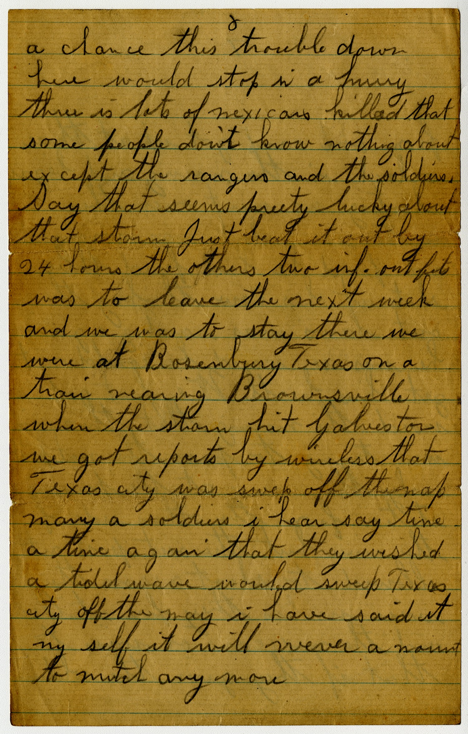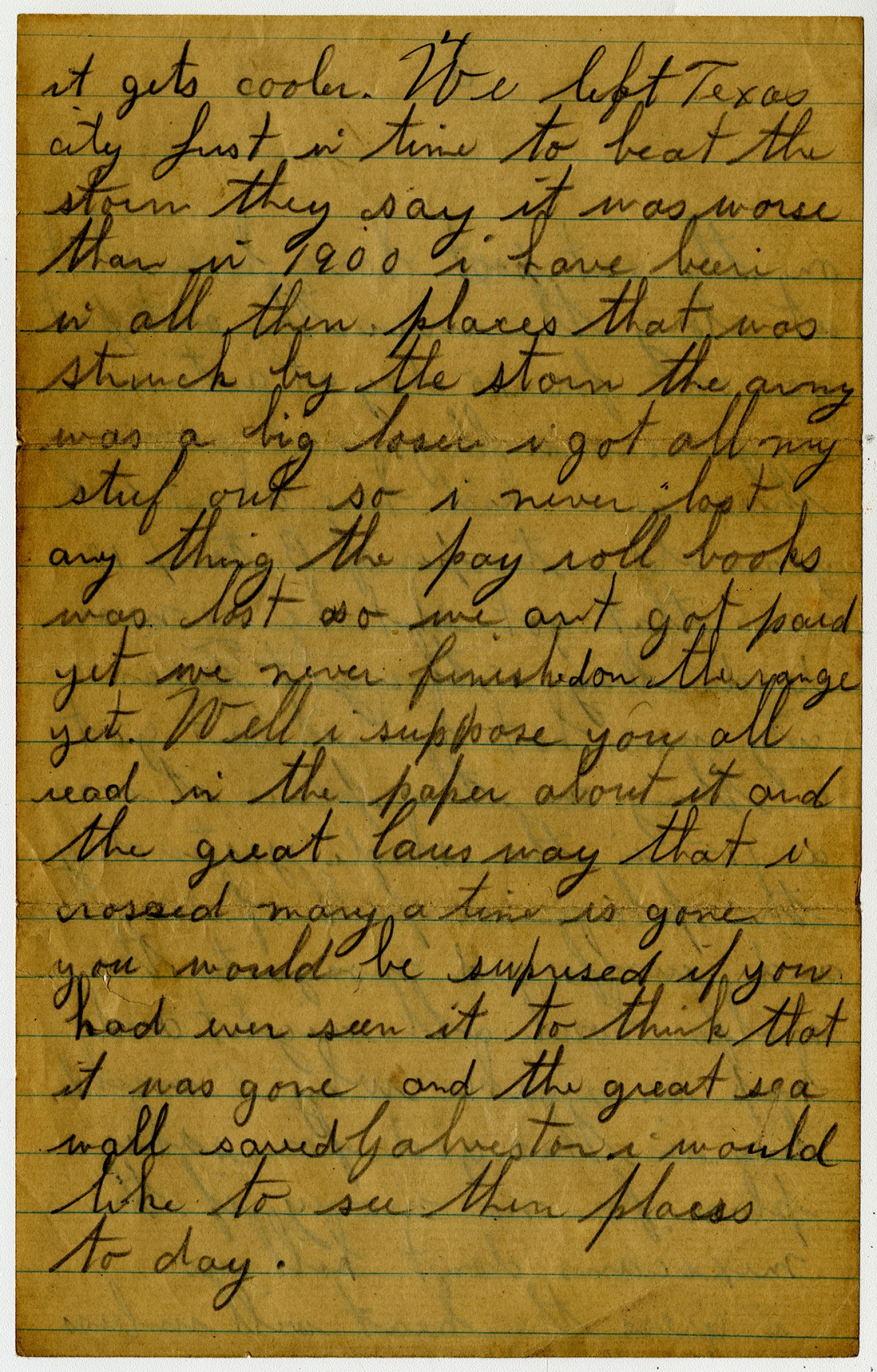 [page 4] it gets cooler. We left Texas city [Texas] just in time to beat the storm they say it was worse than in 1900 i have been in all then places that was struck by the storm the army was a big loser i got all my stuf out so i never lost any thing the pay roll books was lost so we ant got paid yet we never finished do the range yet. Well i suppose you all read in the paper about it and the great Causeway that i crossed many a time is gone you would be surprised if you had ever seen it to think that it was gone and the great sea wall saved Galveston[Texas] i would like to see then places to day.