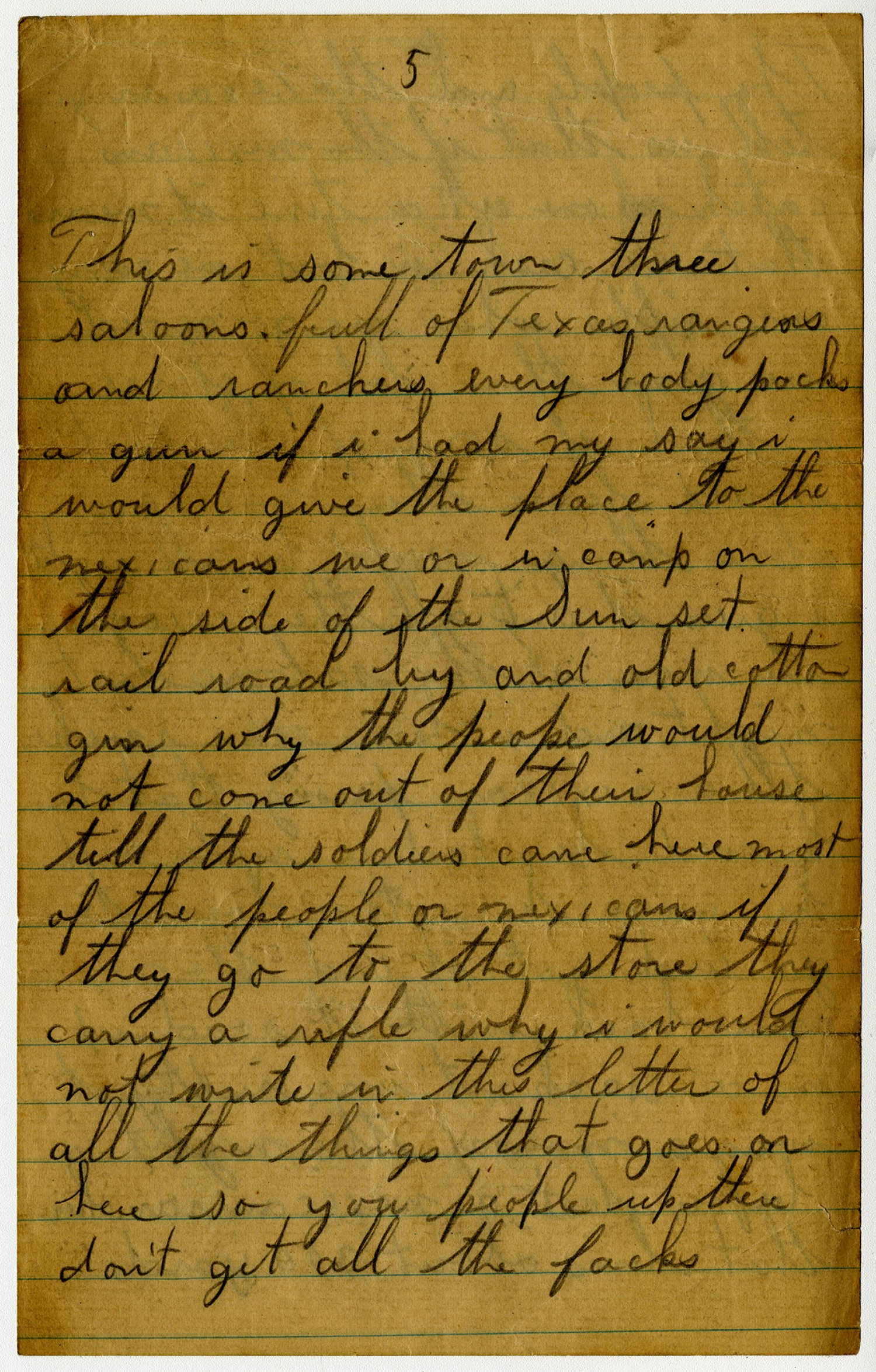 [page 5] This is some town three saloons full of Texas rangers and ranchers every body packs a gun if i had my say i would give the place to the mexicans we or in camp on the side of the Sun set rail road by and old cotton gin why the peope would not come out of their house till the soldiers came here most of the people or mexicans if they go to the store they carry a rifle why i would not write in this letter of all the things that goes on here so you people up there don