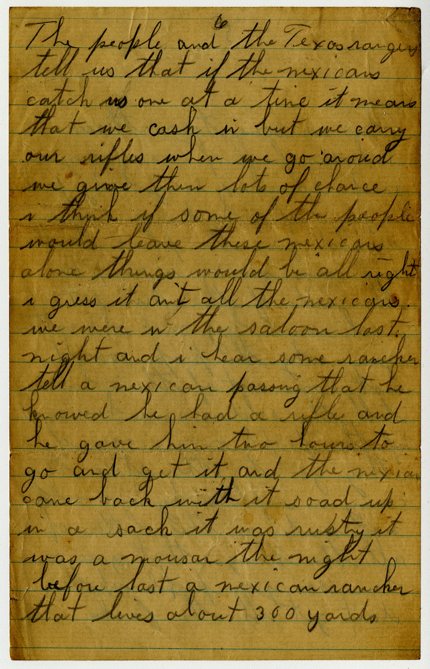 [page 6] The people and the Texas rangers tell us that if the mexicans catch us one at a time it means that we cash in but we carry our rifles when we go aroud we give them lots of chance i think if some of the people would leave these mexicans alone things would be all right i guess it ant all the mexicans. we were in the saloons last night and i hear some rancher tell a mexican passing that he knowed he had a rifle and he gave him two hours to go and get it and the mexican came back with it and soad up in a sack it was rusty it was a mousar the night before last a mexican rancher that lives about 300 yards