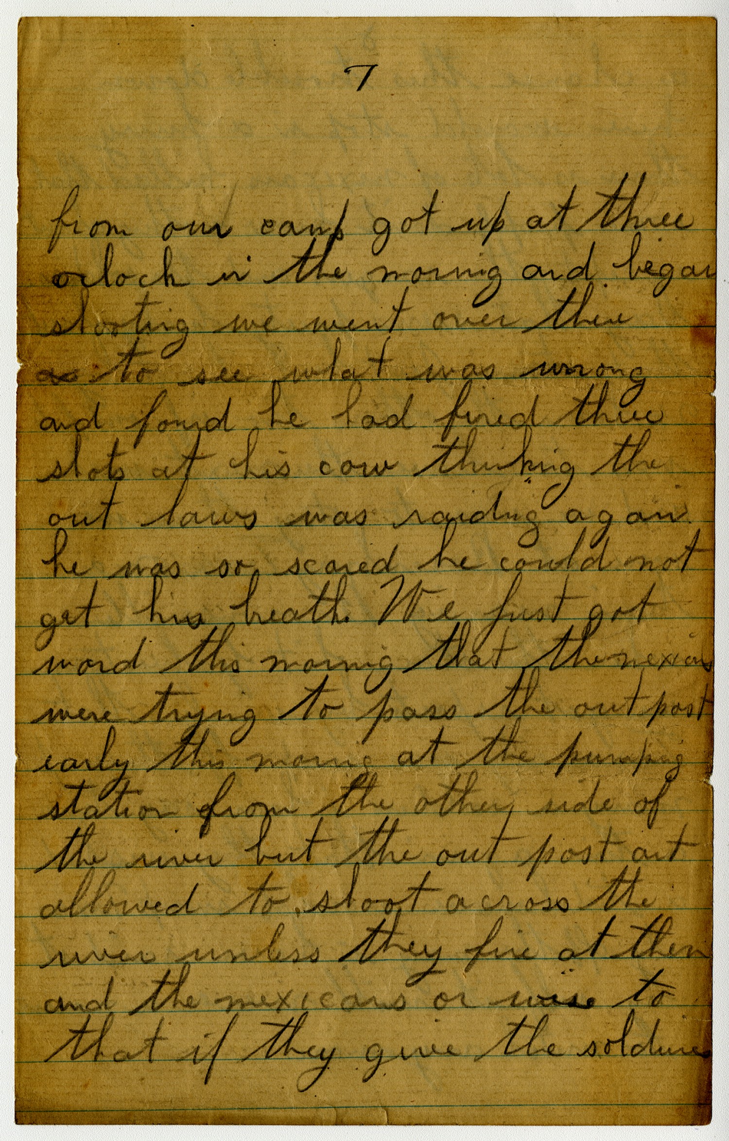 [page 7] from our camp got up at three oclock in the morning and began shooting we went over there to see what was wrong and found he had fired three shots at his cow thinking the out laws was raiding agan he was so scared he could not get his breath. We just got word this morning that the mexicans were trying to pass the out post early this morng at the pumping station from the other side of the river but the out post ant allowed to shoot across the river unless they fire at them and the mexicans or wise to that if they give the soldieres