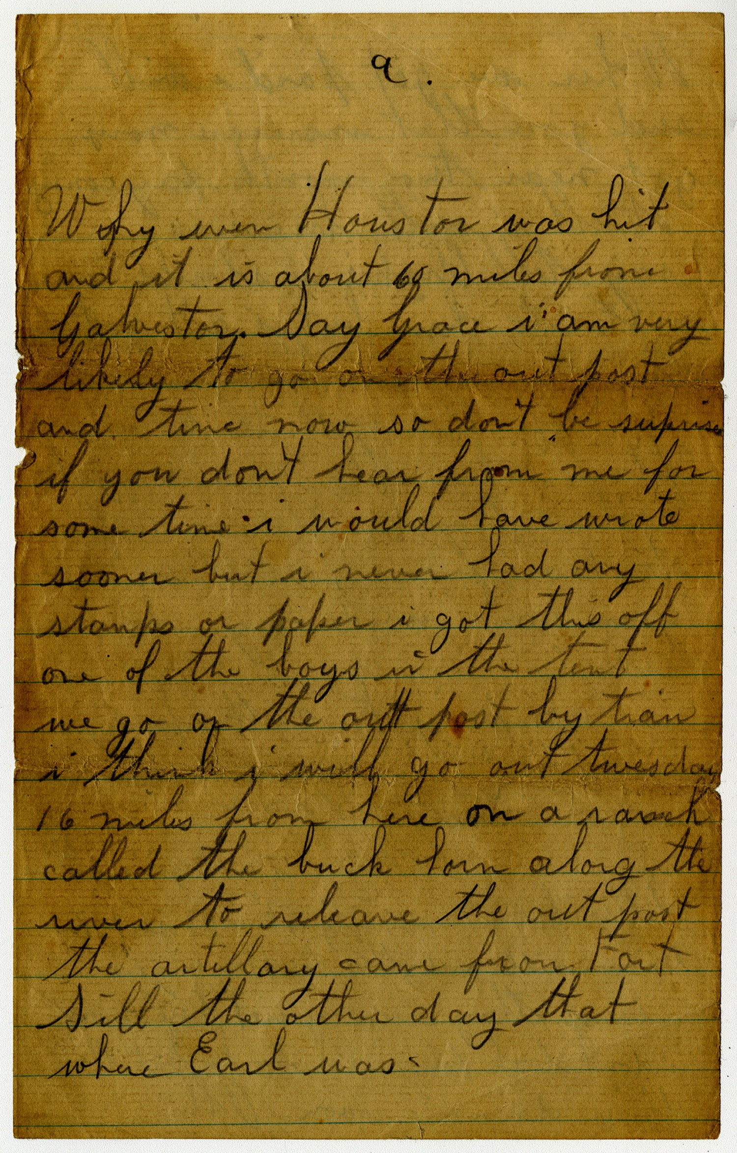 [page 9] Why even Houston [Texas] was hit and it is about 60 miles from Galveston [Texas]. Say Grace i am very likely to go on the out post and time now so don