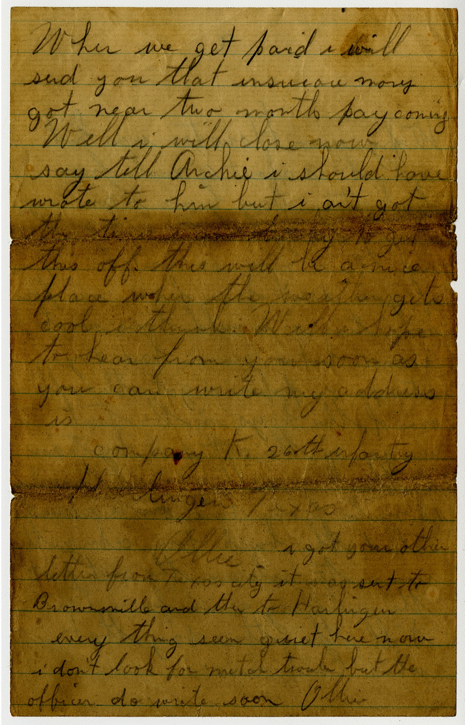 When we get paid i will send you that insurance money got near two months pay coming Well i will close now say tell Archie i should have wrote to him but i an