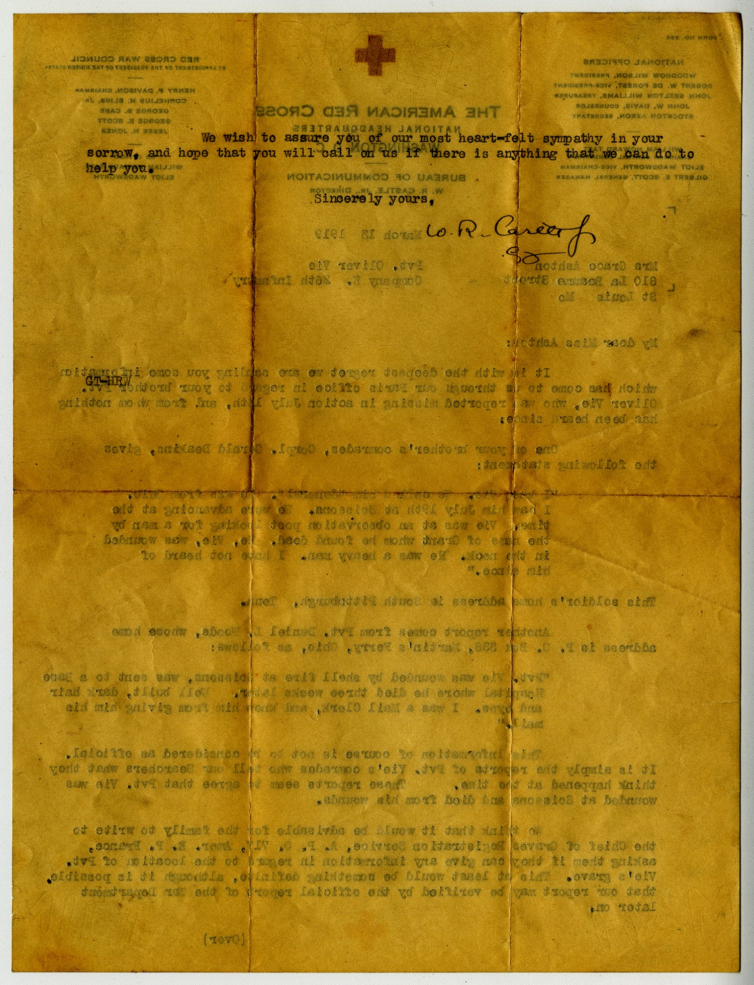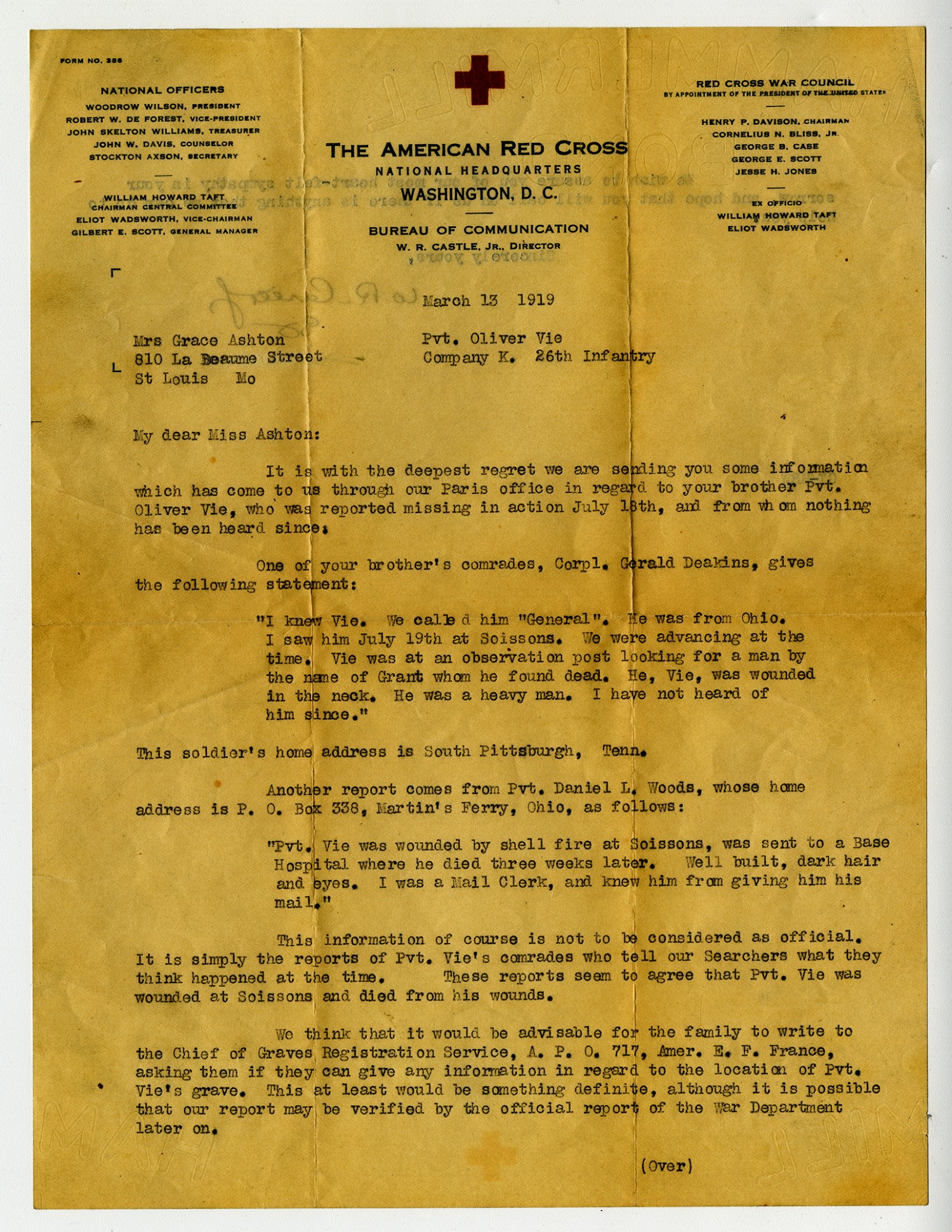 [The American Red Cross letterhead] March 13 1919 Mrs Grace Ashton 810 La Beaume Street St. Louis Mo Pvt. Oliver Vie Company K. 26th Infantry My dear Miss Ashton: It is with the deepest regret we are sending you some information which has come to us through our Paris office in regard to your brother Pvt. Oliver Vie, who was reported missing in action July 18th, and from whom nothing has been heard since. One of your brother