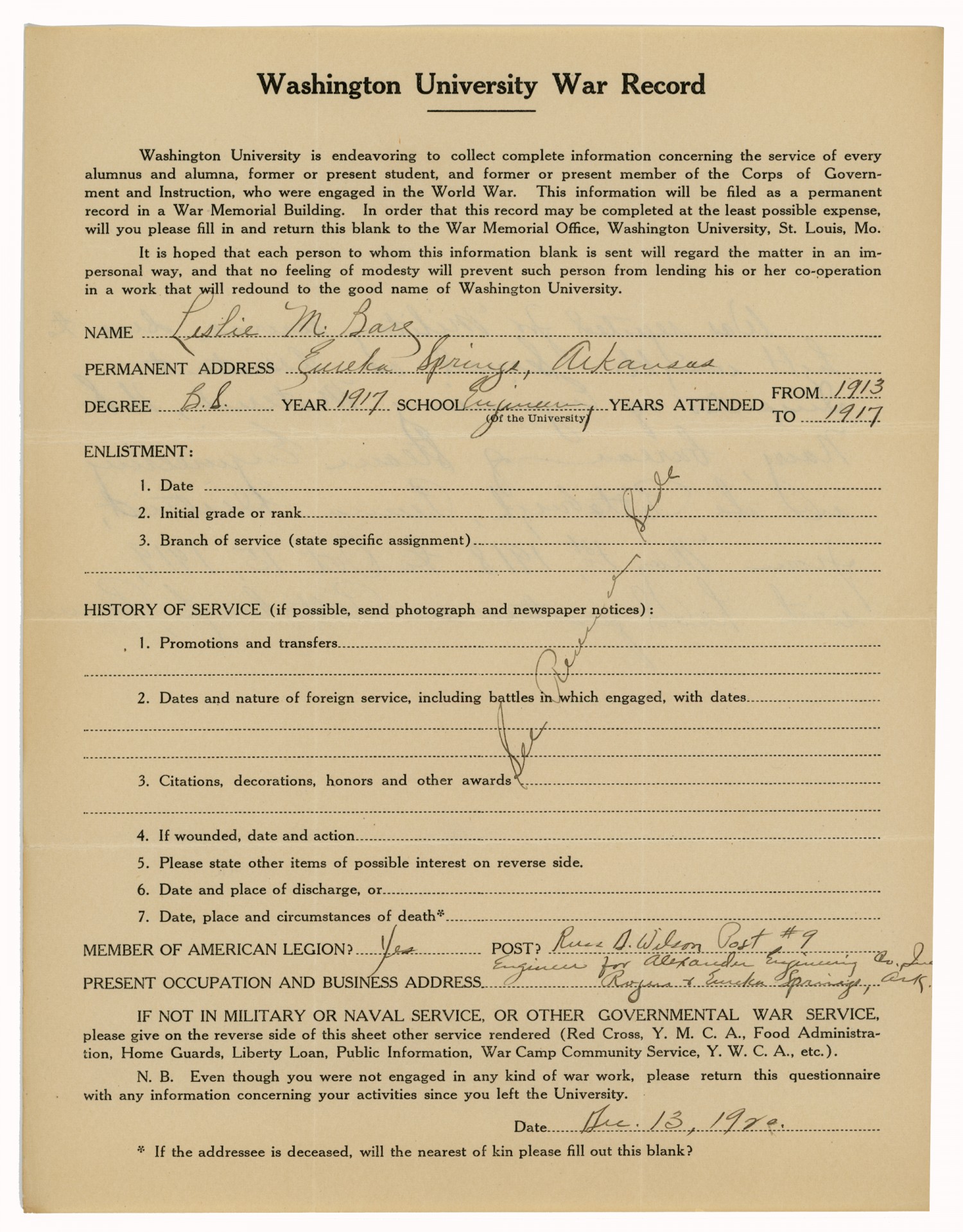War Record of Leslie M Barg