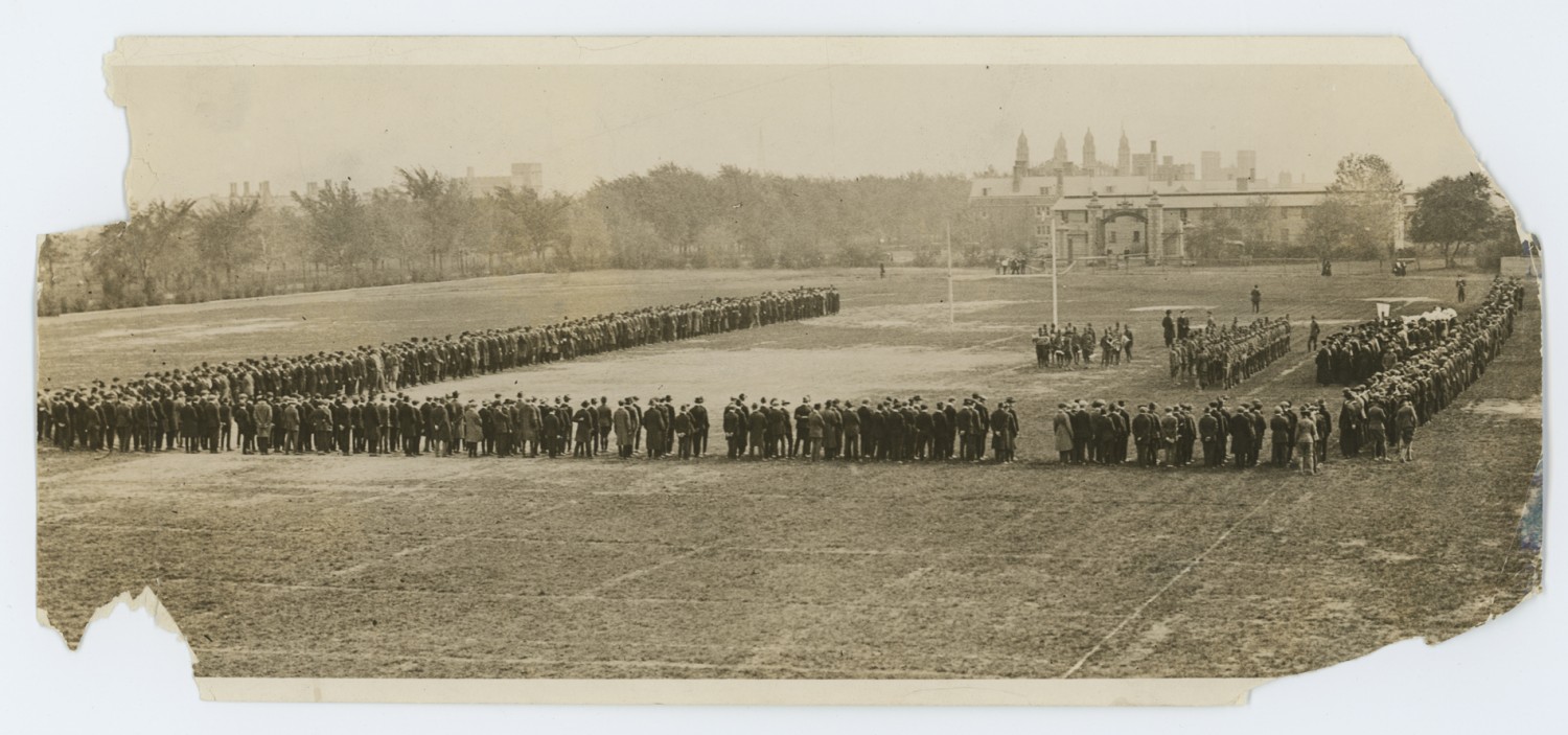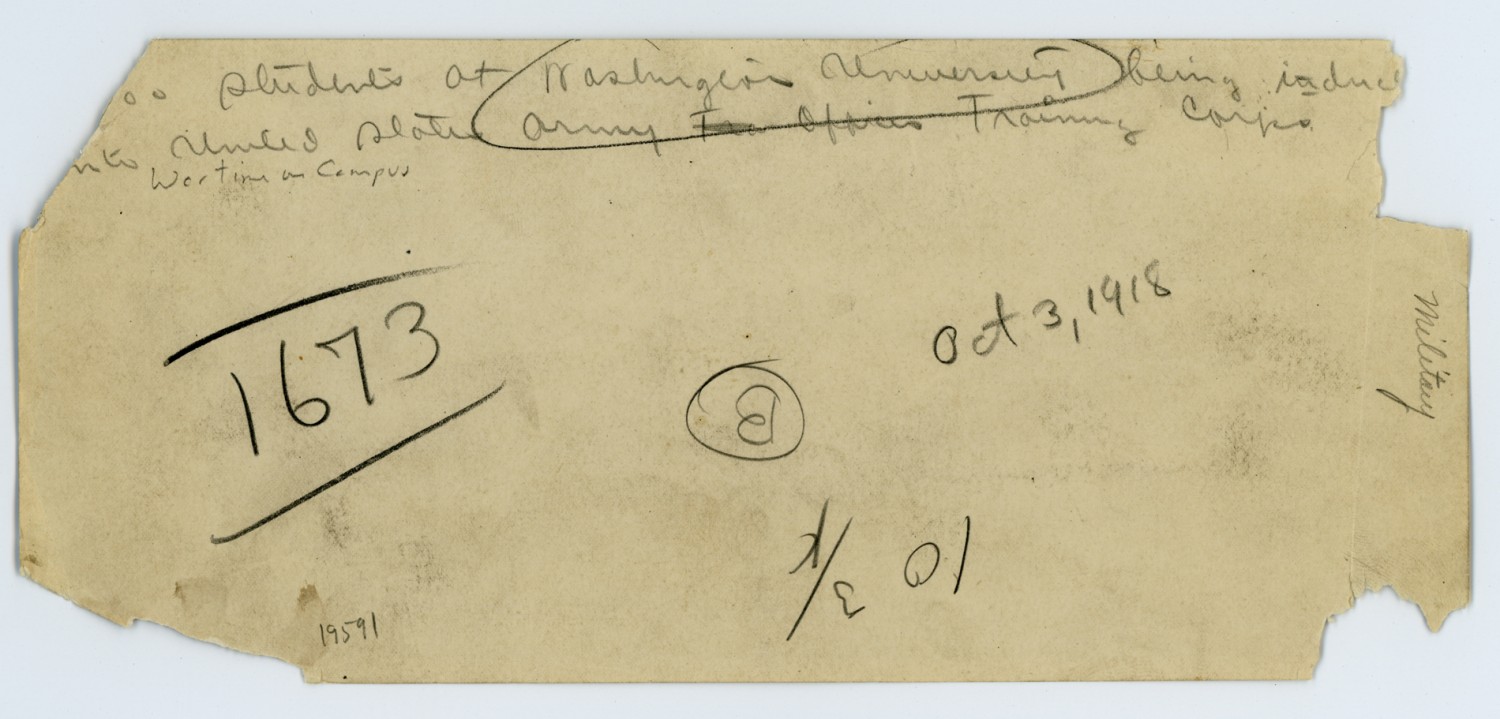 [ms illegible: 1 wd] students at Washington University being inducted into United States Army Officers Training Corps Wartime on Campus [October] 3, 1918 Military 1673