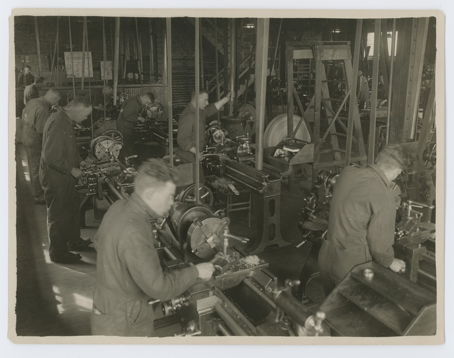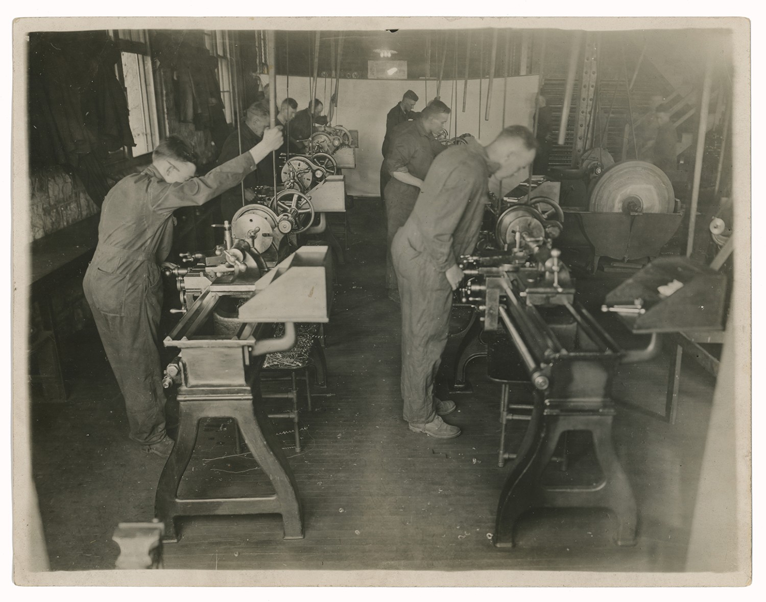 | Description | Unidentified men at work producing material at one of Washington University's Students' Army Training Corps (SATC) shops. During the war, Washington University's campus life drastically changed. With men joining the military, a smaller mostly female student body existed. They staffed Red Cross Units and produced dressings. War-related courses were offered such as radio communications, machine shop training, and blacksmithing. In 1918 the arrival of men in the Students' Army Training Corps turned Washington University into a training ground with every building on campus used for government purposes. |
