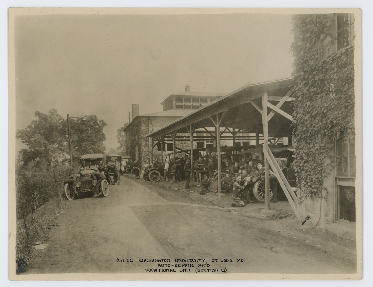 | Description | Exterior of Washington University's Students' Army Training Corps auto repair shop. Men are gathered around parked cars outside the shop. During the war, Washington University's campus life drastically changed. With men joining the military, a smaller mostly female student body existed. They staffed Red Cross Units and produced dressings. War-related courses were offered such as radio communications, machine shop training, and blacksmithing. In 1918 the arrival of men in the Students' Army Training Corps turned Washington University into a training ground with every building on campus used for government purposes. |