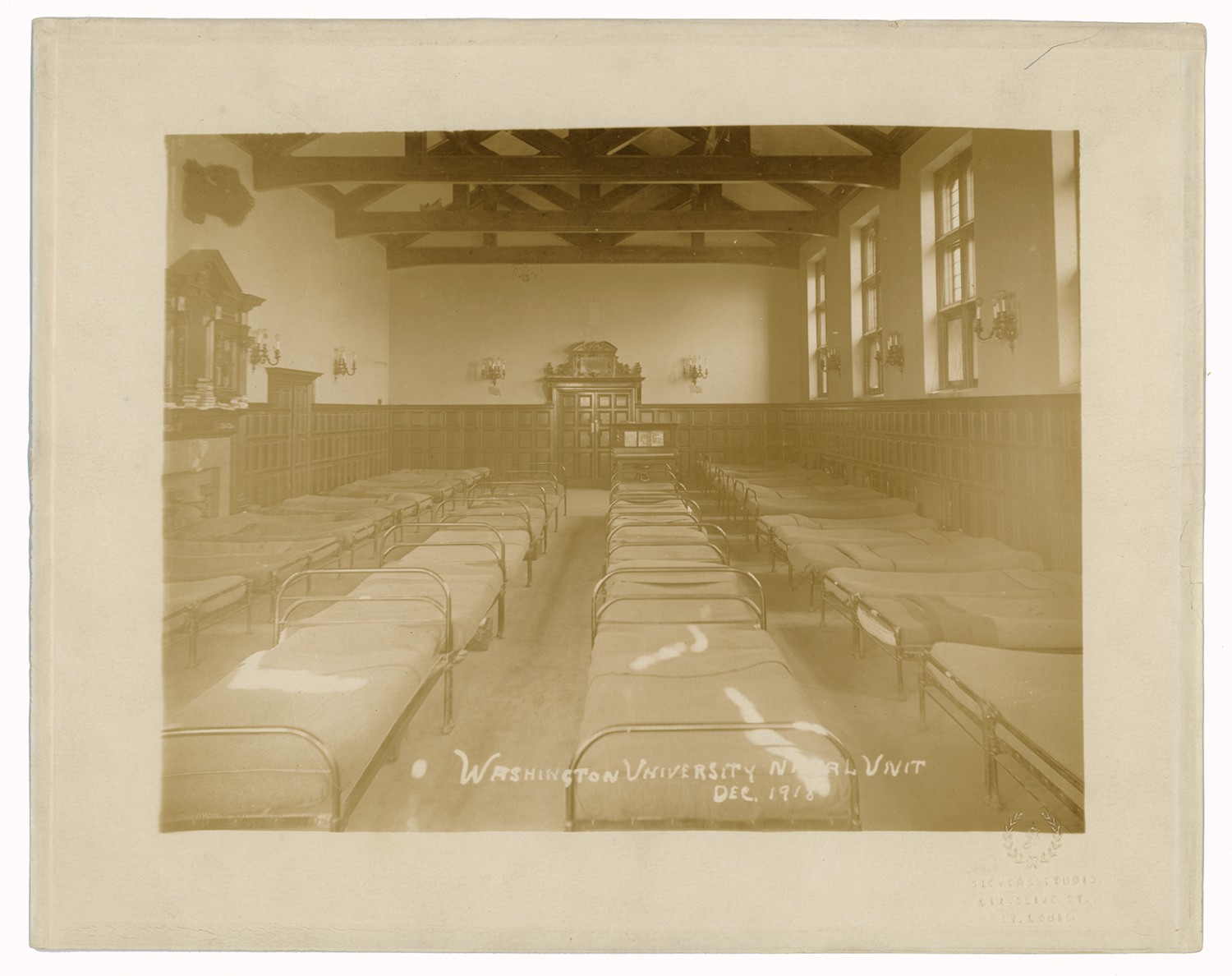 | Description | Interior of the Washington University naval unit during December 1918. During the war, Washington University's campus life drastically changed. With men joining the military, a smaller mostly female student body existed. They staffed Red Cross Units and produced dressings. War-related courses were offered such as radio communications, machine shop training, and blacksmithing. In 1918 the arrival of men in the Students' Army Training Corps turned Washington University into a training ground with every building on campus used for government purposes. |