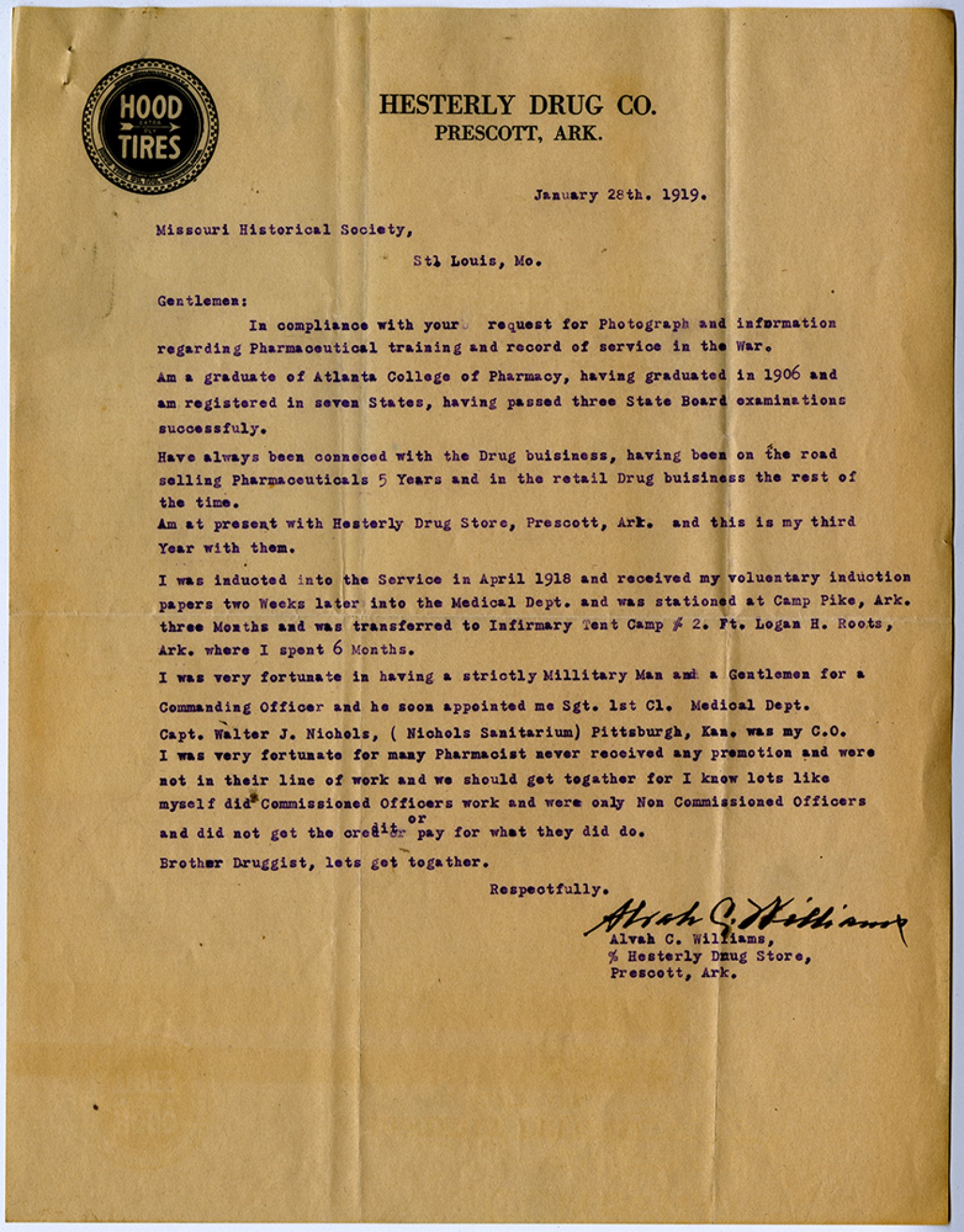 January 28th, 1919. Missouri Historical Society, St. Louis, [Missouri] Gentlemen: In compliance with your request for photograph and information regarding Pharmaceutical training and record of service in the War. Am a graduate of Atlanta College of Pharmacy, having graduated in 1906 and am registered in seven States, having passed three State Board examinations successfuly. Have always been connected with the Drug buisiness, having been on the road selling Pharmaceuticals 5 Years and in the retail Drug business the rest of the time. Am at present with Hesterly Drug store, Prescott, [Arkansas] and this is my third Year with them. I was inducted into the Service in April 1918 and received my voluentary induction papers two Weeks later into the Medical Dept. and was stationed at Camp Pike, [Arkansas] three Months and was transferred to Infirmary Tent Camp # 2. [Fort] Logan H. Roots, [Arkansas] where I spent 6 Months. I was very fortunate in having a strictly Millitary man and a Gentlemen for a Commanding Officer and he soon appointed me Sgt. 1st Cl. Medical Dept. Capt. Walter J. Nichols, (Nichols Sanitarium) Pittsburgh, [Kansas] was my C.O. I was very fortunate for many Pharmacist never received any promotion and were not in their line of work and we should get together for I knew lots like myself did Commissioned Officers work and were only Non Commissioned Officers and did not get the credit or pay for what they did do. Brother Druggist, lets get together. Respectfully. Alvah C. Williams, c/o Hesterly Drug Store, Prescott, [Arkansas]