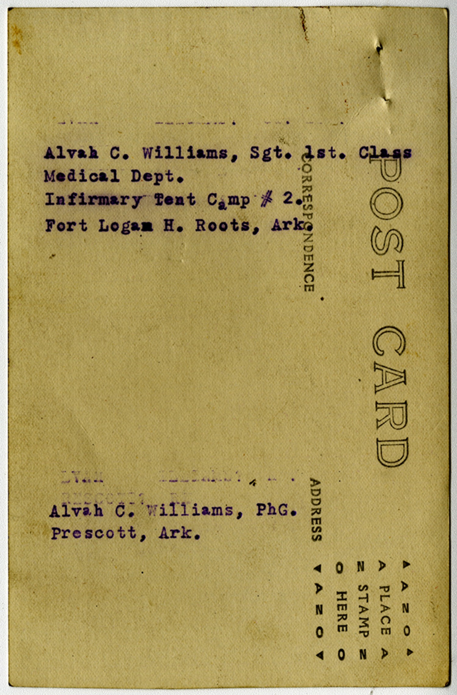 Alvah C. Williams, Sgt. 1st. Class Medical Dept. Infirmary Tent Camp#2. Fort Logan H. Roots, [Arkansas] Alvah C. Williams, PhG. Prescott, [Arkansas]