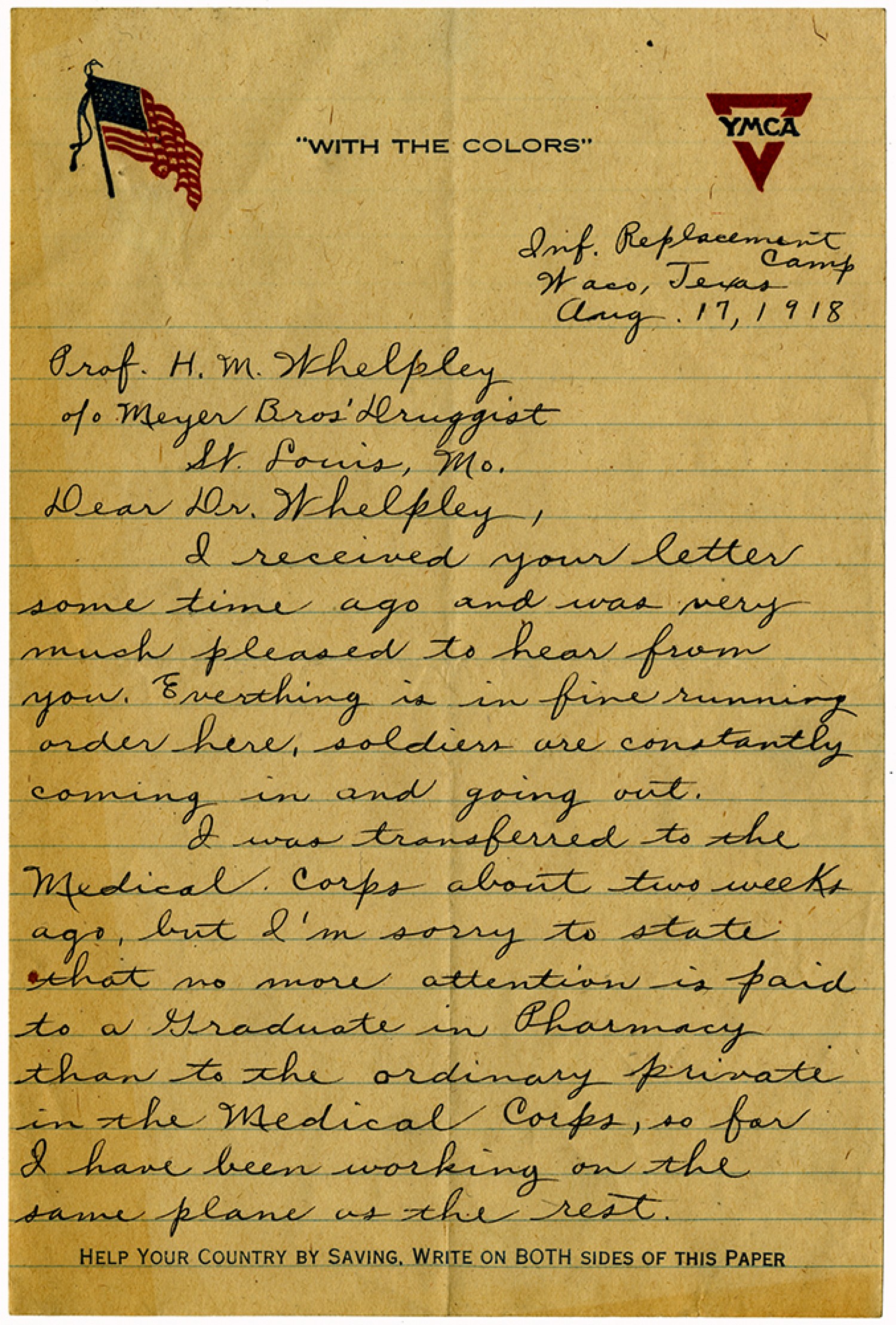 Inf. Replacement Camp Waco, Texas [August] 17, 1918 Prof. [Henry Milton] Whelpley c/o Meyer [Brothers] Druggist St. Louis, [Missouri] Dear Dr. Whelpley, I received your letter sometime ago and was very much pleased to hear from you. Everything is in fine running order here, soldiers are constantly coming in and going out. I was transferred to the Medical Corps about two weeks ago, but I’m sorry to state that no more attention is paid to a Graduate in Pharmacy than to the ordinary private in the Medical Corps, so far I have been working on the same plane as the rest.