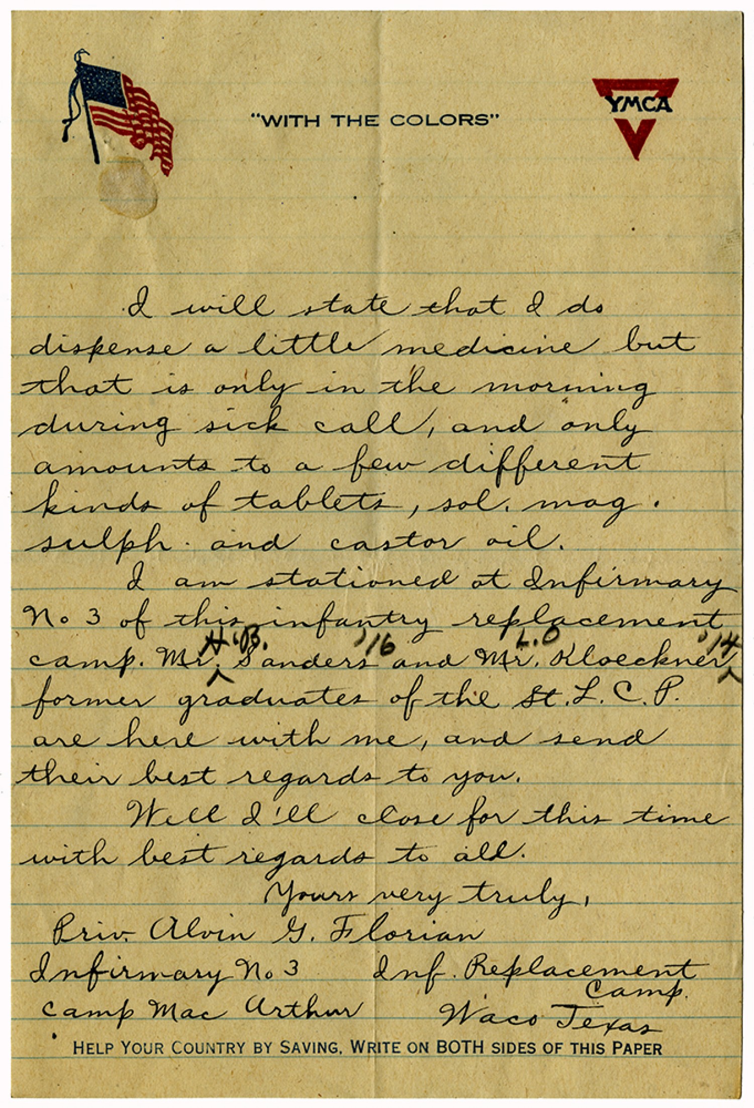 I will state that I do dispense a little medicine but that is only in the morning during sick call, and only amounts to a few different kinds of tablets, sol. mag. sulph and castor oil. I am stationed at infirmary No 3 of this infantry replacement camp. Mr. H.B. Sanders [1916] and Mr. L.O Kloeckner [1914] former graduates of the [St. Louis College of Pharmacy] are here with me, and send their best regards to you. Well I’ll close for this time with best regards to all. Yours very truly, Priv. Alvin G. Florian Infirmary No 3 Inf. Replacement Camp Camp Mac Arthur Waco Texas