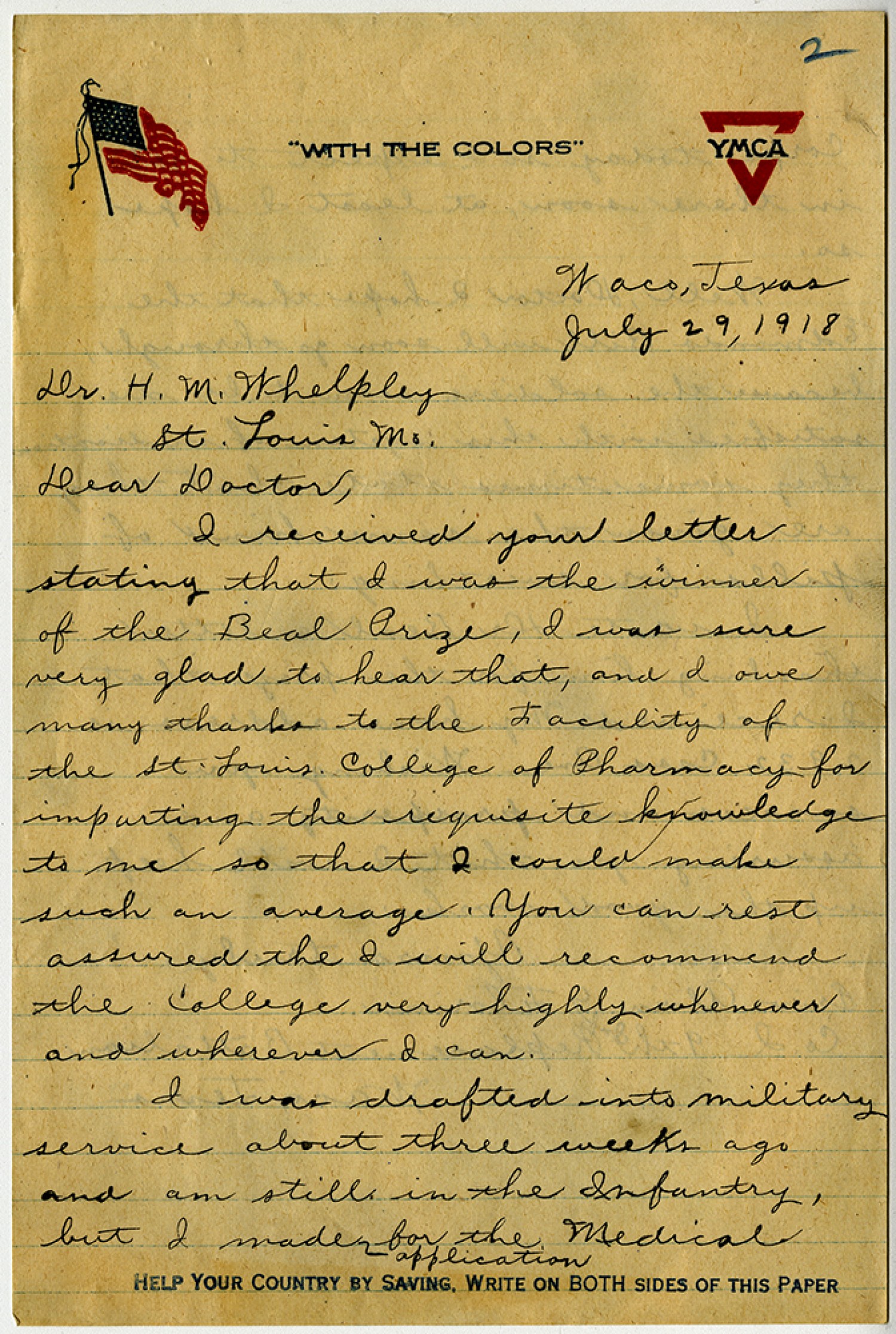 Waco, Texas July 29, 1918 Dr. [Henry Milton] Whelpley St. Louis [Missouri] Dear Doctor, I received your letter stating that I was the winner of the Beal Prize, I was sure very glad to hear that, and I owe many thanks to the faculty of the St. Louis College of Pharmacy for importing the requisite knowledge to me so that I could make such an average. you can rest assured the I will recommend the College very highly whenever and wherever I can. I was drafted into military service about three weeks ago and am still in the Infantry, but I made application for the Medical