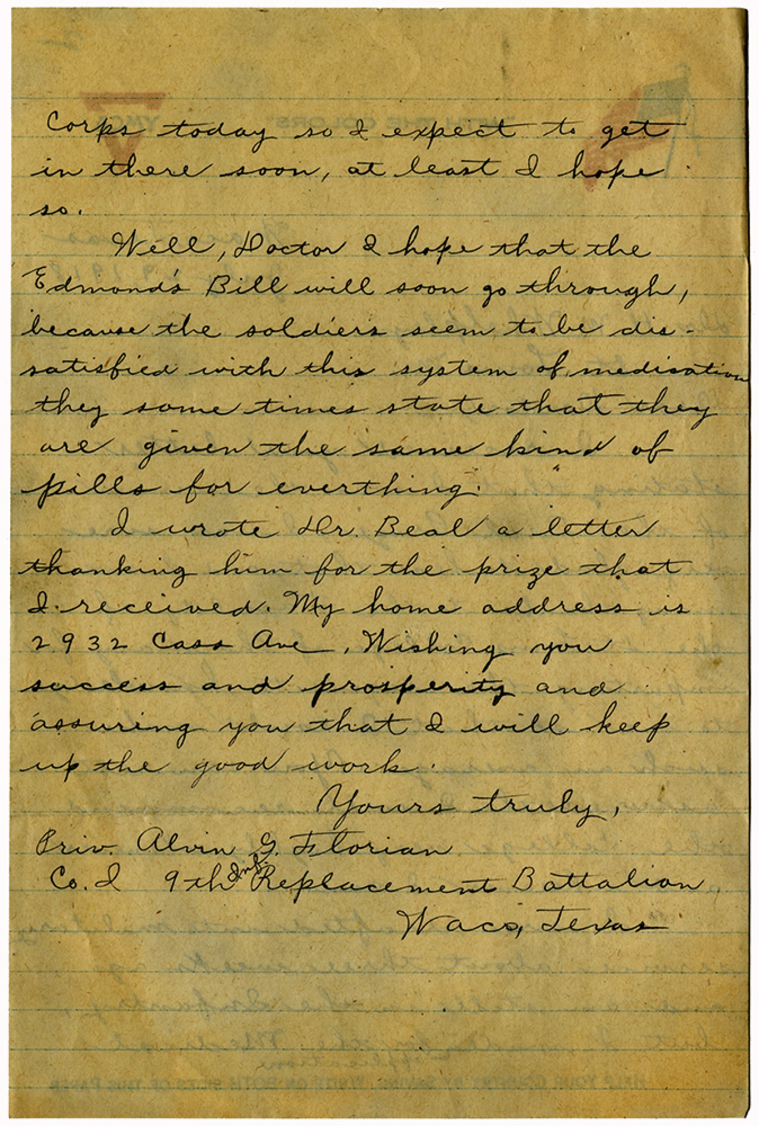 Corps today so I expect to get in there soon, at least I hope so. Well, Doctor I hope that the Edmond’s Bill will soon go through, because the soldiers seem to be dissatisfied with this system of medication they some times state that they are given the same kind of pills for everything. I wrote Dr. Beal a letter thanking him for the prize that I received. My home address is 2932 Cass Ave. Wishing you success and prosperity and assuring you that I will keep up the good work. Yours truly, Priv. Alvin G. Florian Co. I. 9th Replacement Battalion Waco, Texas