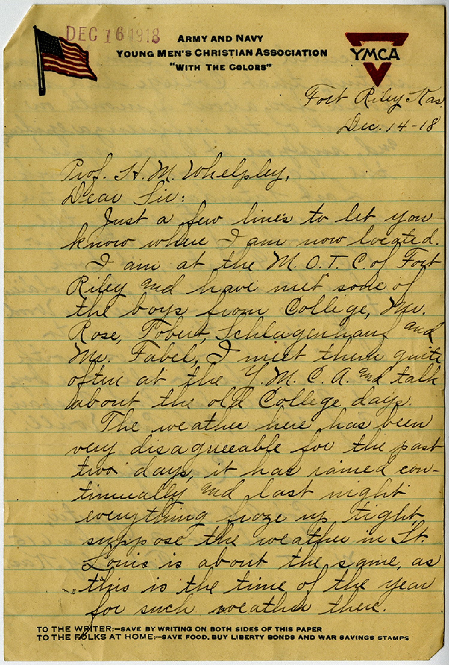 Fort Riley [Kansas] [December] 14 – [1918] Prof. [Henry Milton] Whelpley, Dear Sir: Just a few lines to let you know where I am now located. I am at the M.O.T.C. of Fort Riley [Kansas] and have met some of the boys from College, [Missouri] Rose, Tobert, Schlagenhauf and Mr. Fabel. I meet them quite often at the Y.M.C.A. and talk about the old College days. The weather here has been very disagreeable for the past two days, it has rained continually and last night everything froze up tight, suppose the weather in St. Louis is about the same, as this is the time of the year for such weather there.