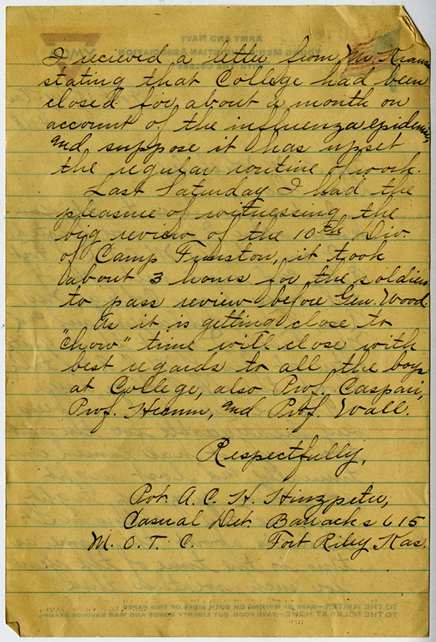 I received a little from Mr. Kranse stating that College had been closed for about a month on account of the influenza epidemic, and suppose it has upset the regular routine of work. Last Saturday I had the pleasure of witnessing the big review of the 10th [Division] of Camp Funston [Kansas], it took about 3 hours for the soldiers to pass review before [General] Wood. As it is getting close to “chow” time will close with best regards to all the boys at College, also Prof. Caspari, Prof. Hernm, and Prof. Wall. Respectfully, Pvt. A.C.H. Hinzpeter, Casual Det. Barracks 615 M.O.T.C. Fort Riley [Kansas]