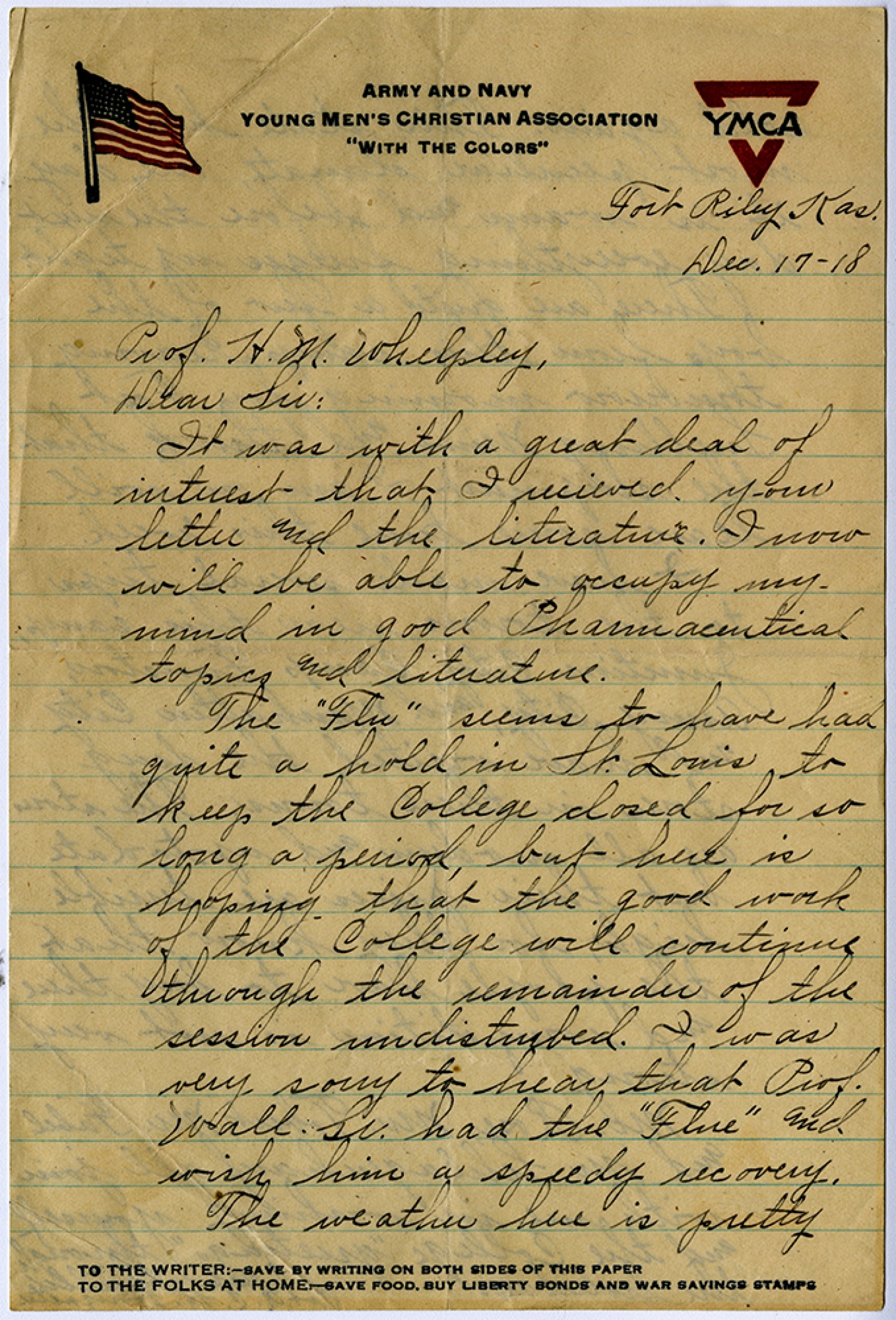 Fort Riley, [Kansas] [December] 17 [1918] Prof. [Henry Milton] Whelpley, Dear Sir: It was with a great deal of interest that I recieved your letter and the literature. I now will be able to occupy my mind in good Pharmaceutical topics and literature. The “Flu” seems to have had quite a hold in the St. Louis to keep the College closed for so long a period, but here is hoping that the good work of the College will continue through the remainder of the session undisturbed. I was very sorry to hear that Prof. Wall Sr. had the “Flu” and wish him a speedy recovery. The weather here is pretty